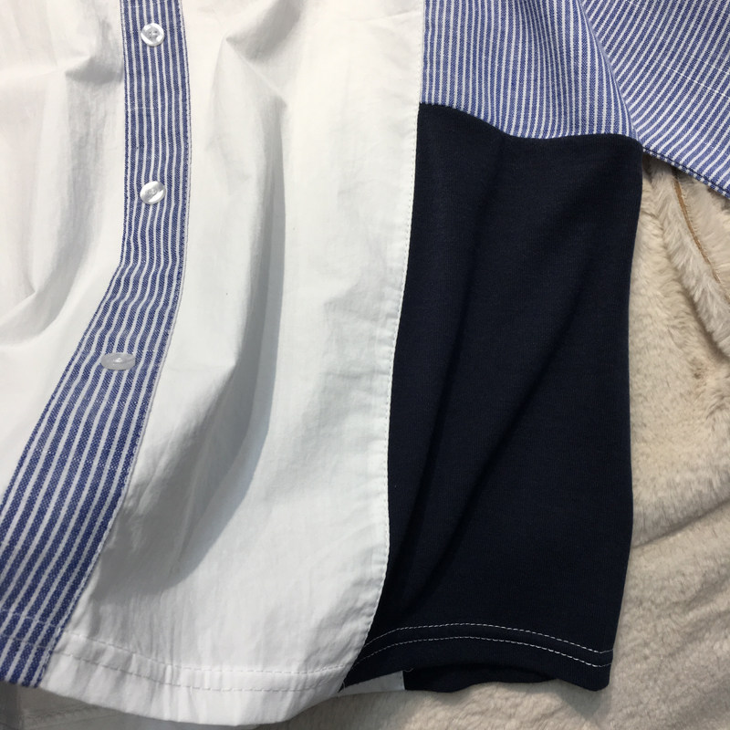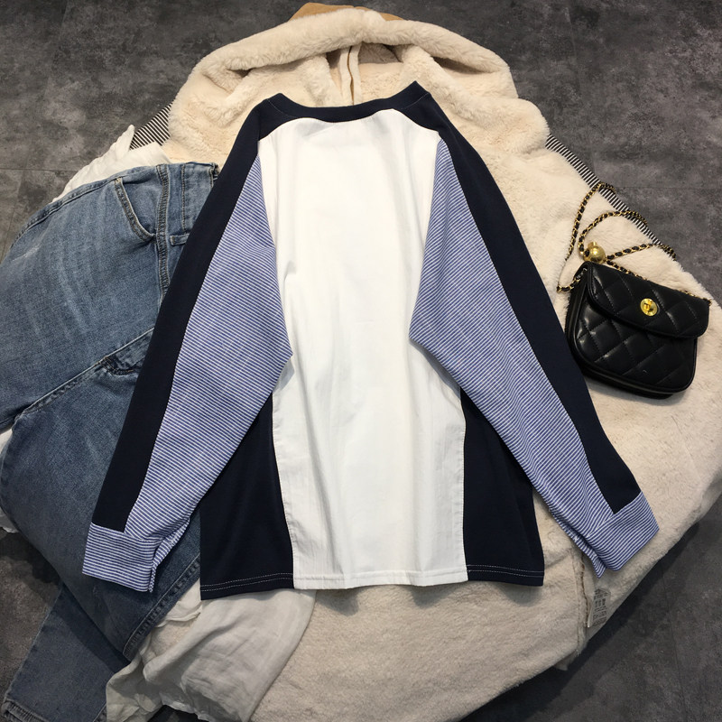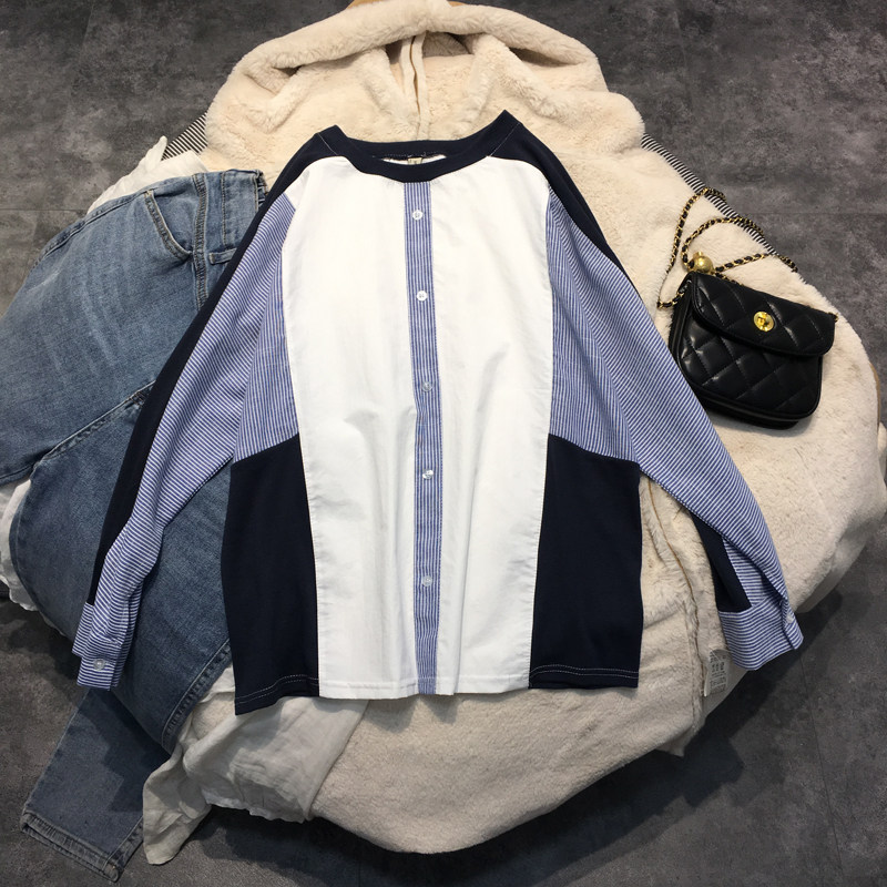 Fat mm Skin Han Edition New Round-collar Strip Sticking Long-sleeved Shirt Woman Large-size loose covering shirt