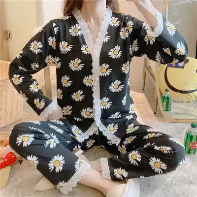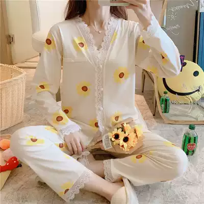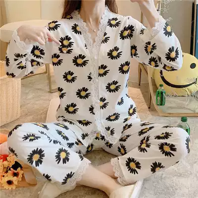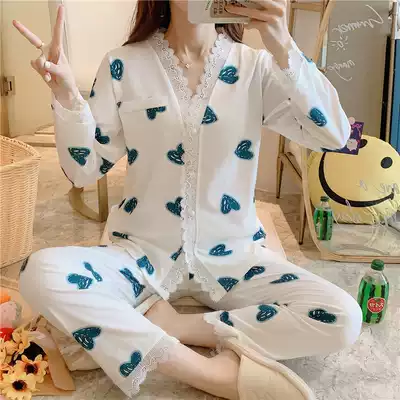 Pajamas women's spring and autumn thin long-sleeved cardigan two-piece suit pure cotton sexy cute lace summer home clothes
