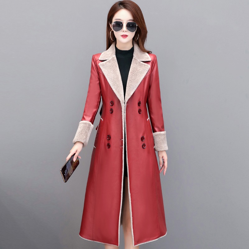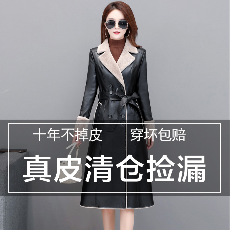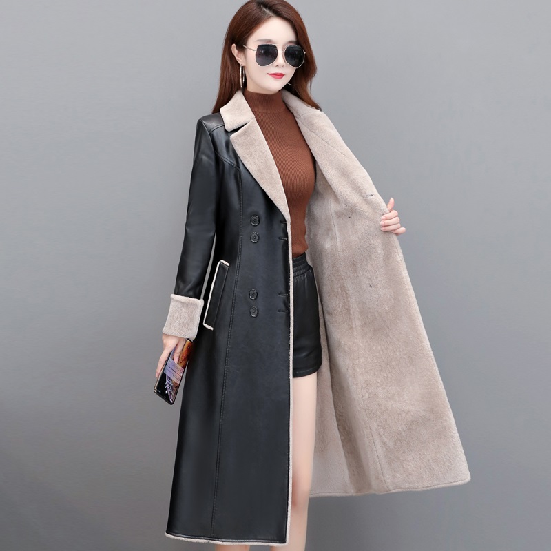 Autumn and winter new Haining leather coat women's mid-length version over-the-knee fur one lamb velvet Korean version slim leather trench coat