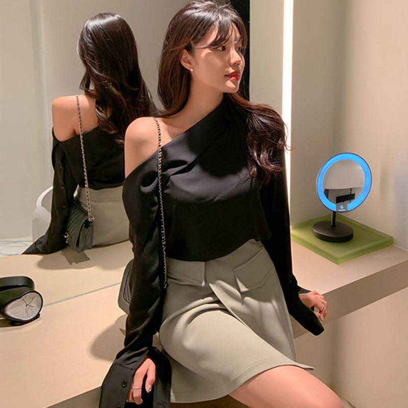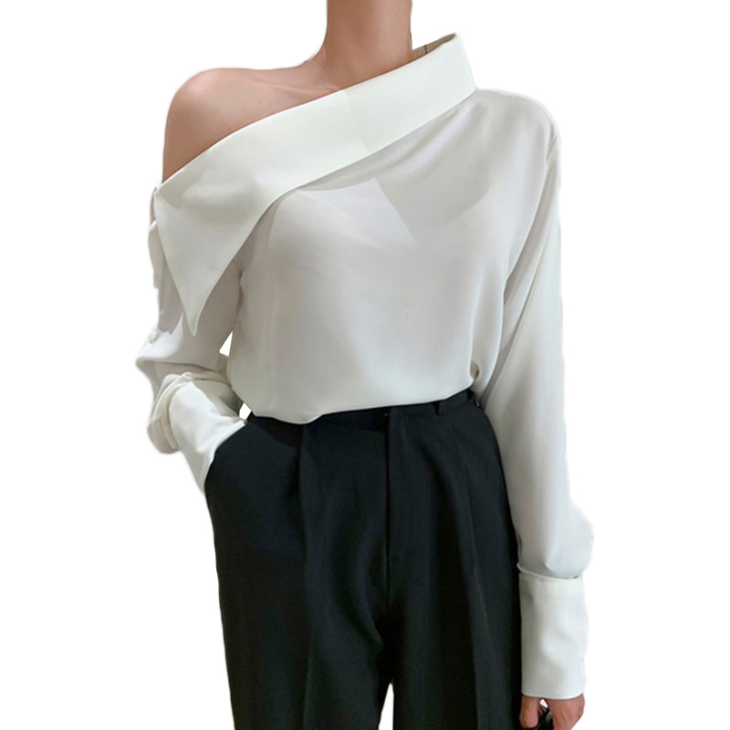 Large size Early autumn new light cooked ethos Goddess Van inclined collar Shoulders Sexy side buttons Long Sleeves Shirt Blouses