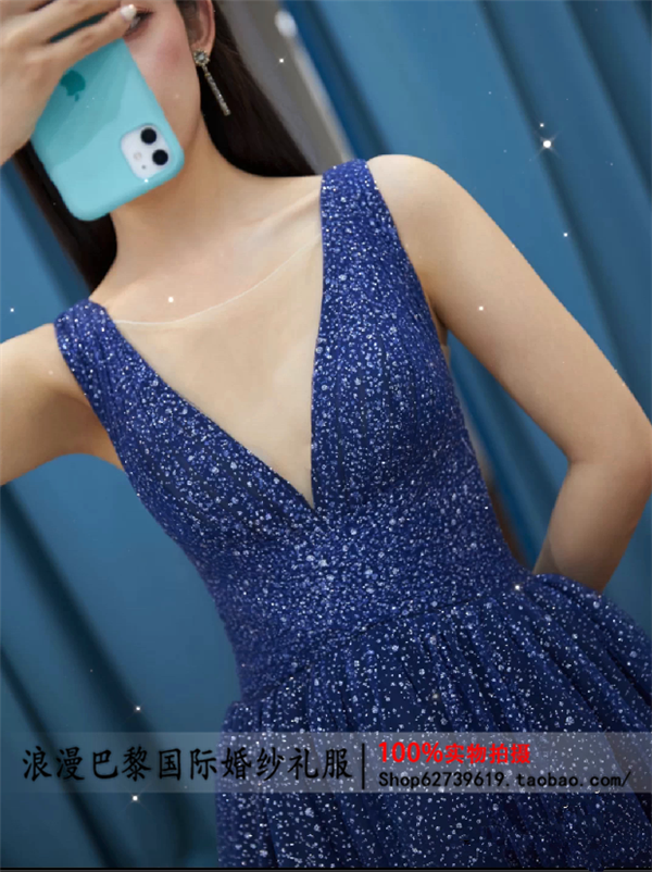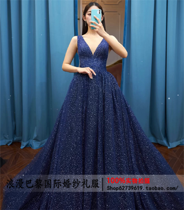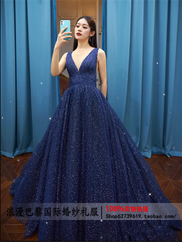 Blue Wedding Dresses Dresses 2021V Collar THIN AIR EVENING GOWN STAGE PERFORMANCE BRIDE'S ANNUAL ART FLUFFY DRESS
