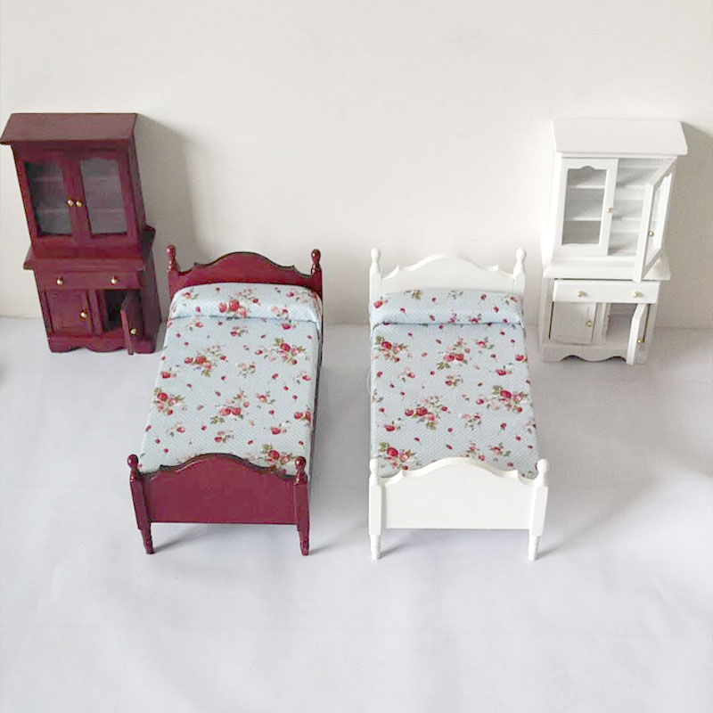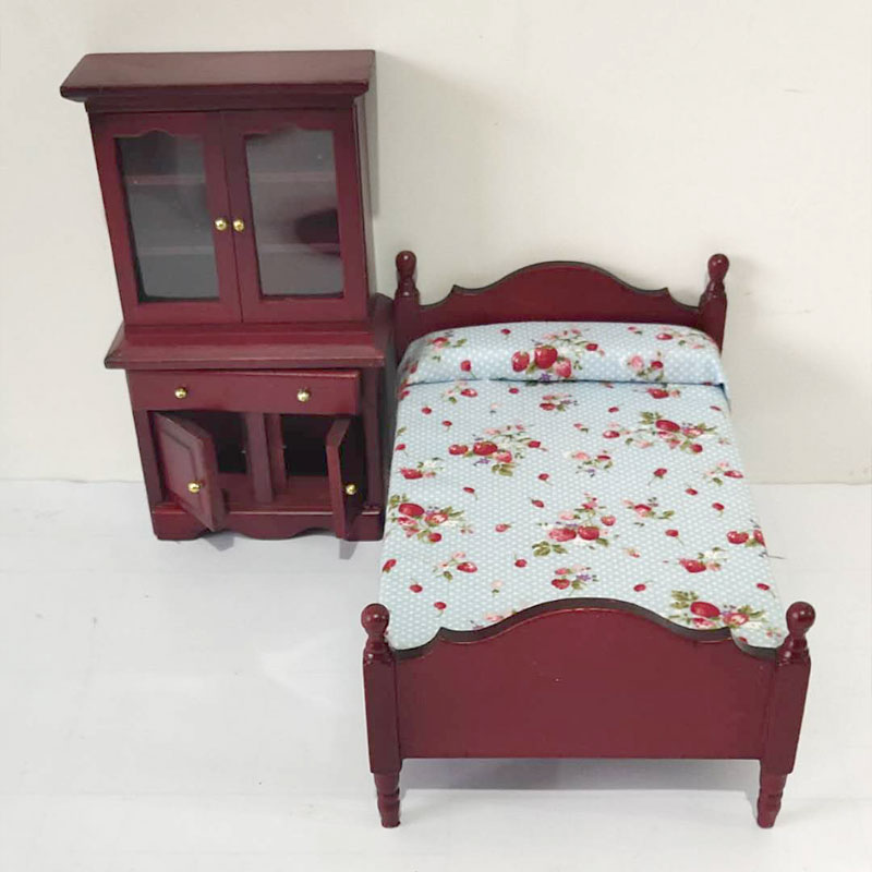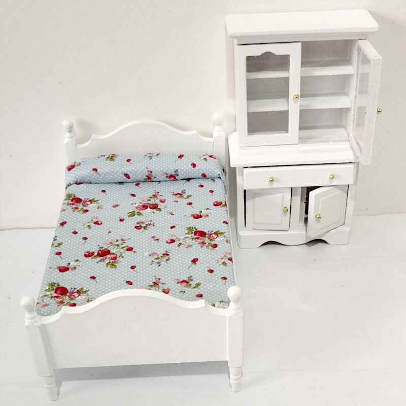 1:12 Doll House home with mini furniture pocket bedroom blue flower cloth single bed craft props fittings