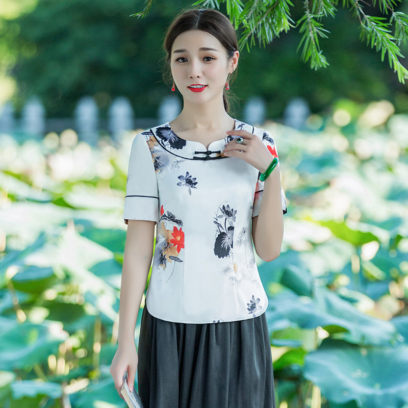 Chinese Classic 2021 Summer New Improved Round Neck Tang Suit Top Everyday Slim and Elegant White Ladies Chinese Style