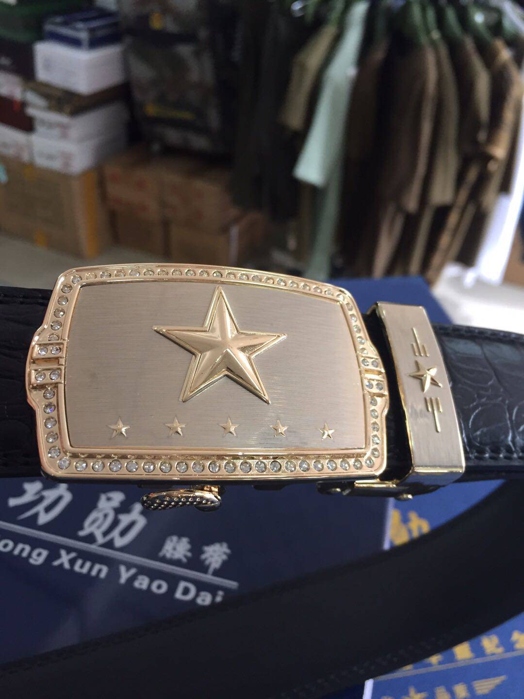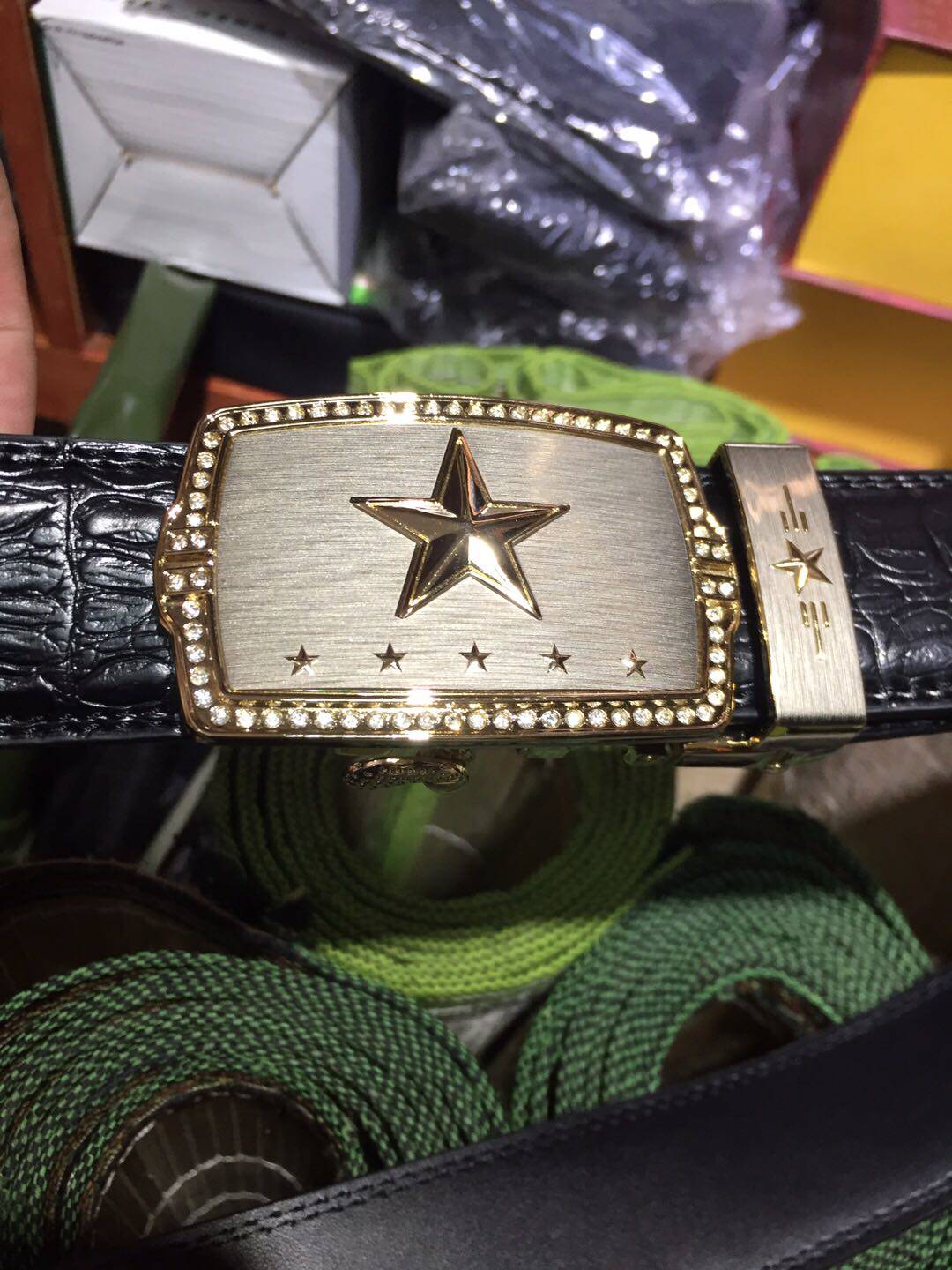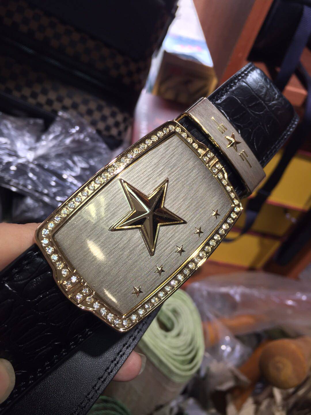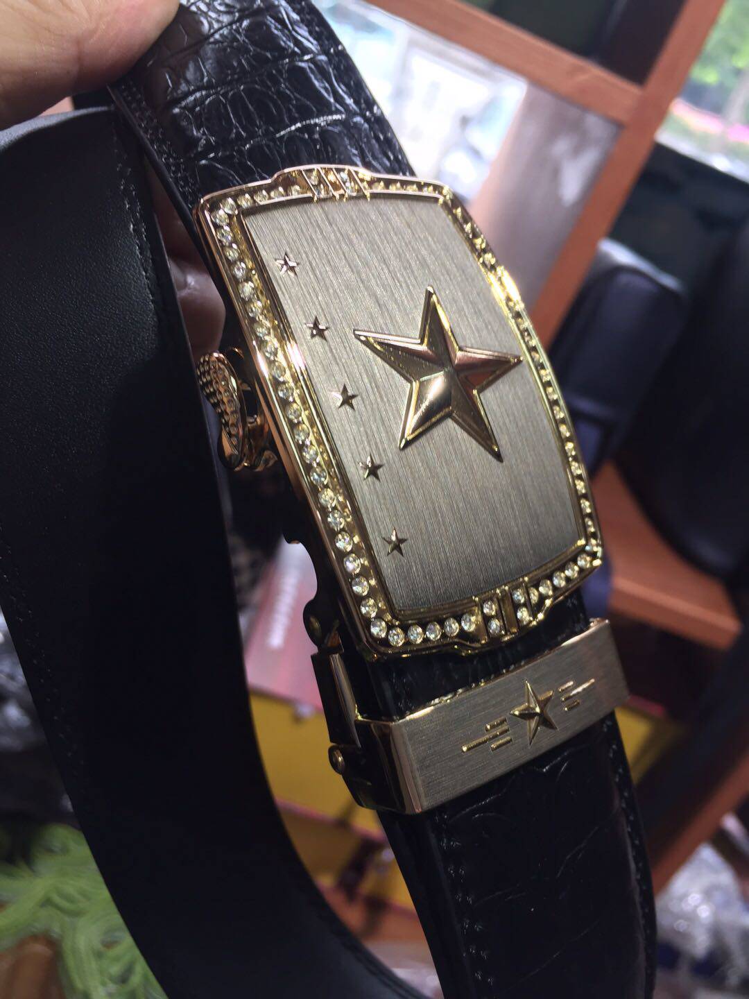 Men's leather belt inlaid drilling 5-star belt buckle head automatic buckle 24K gold plated crocodile thread with body fit gift box