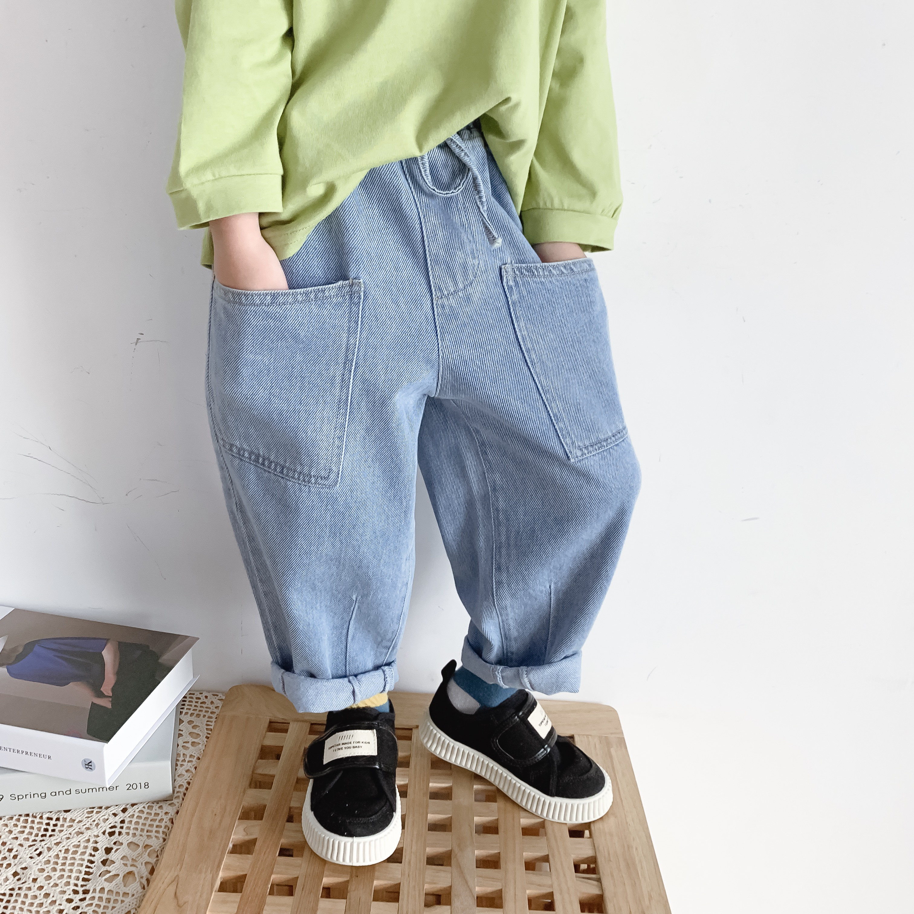 2020 autumn male and female children's baby Han version 100 hitch fashion loose patch pocket soft stretches casual Harun pants jeans tide