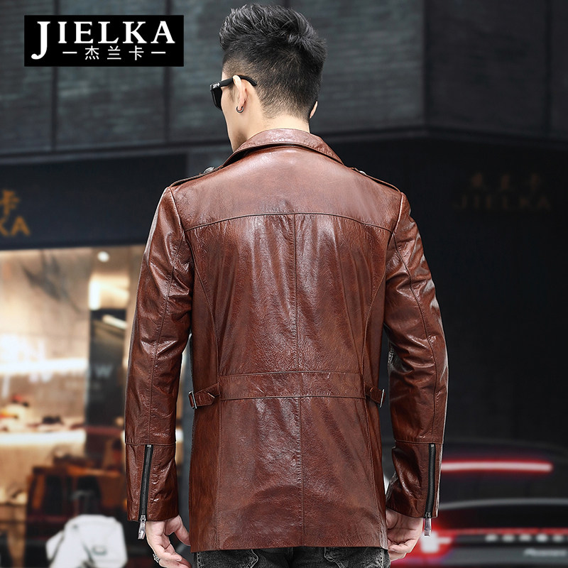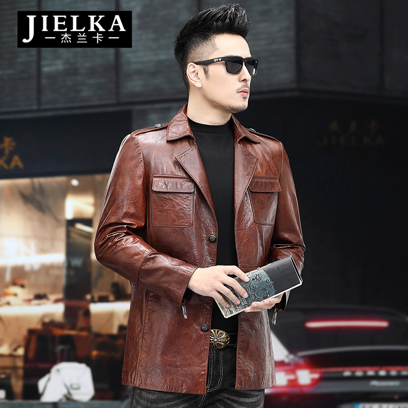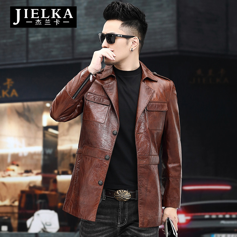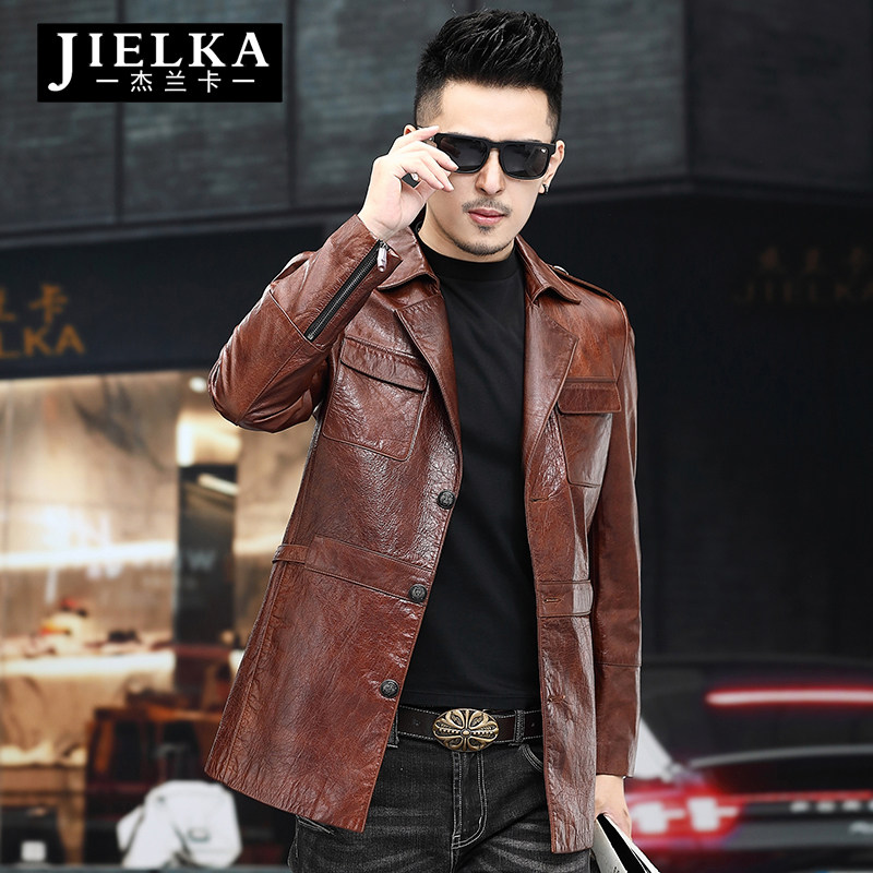 New Henning Leather Coat Leather Windsuit Men's Oil Wax Head Layer Bull Leather Suit Collar Middle Long Version Hunting Autumn Jacket Man