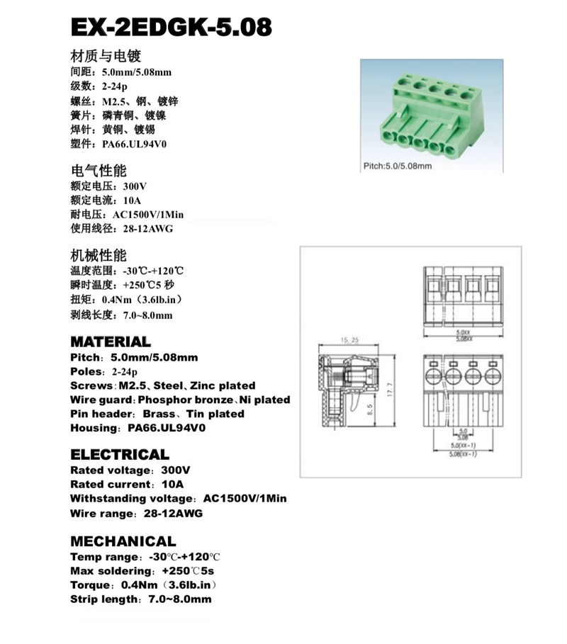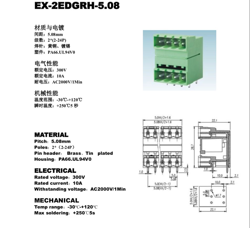 Double layer pluggable terminal block EX2EDGRH-5 08mm