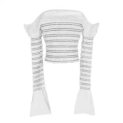 One-shouldered top female ins Hong Kong style off-the-shoulder long-sleeved bandeau design French white pleated striped shirt summer