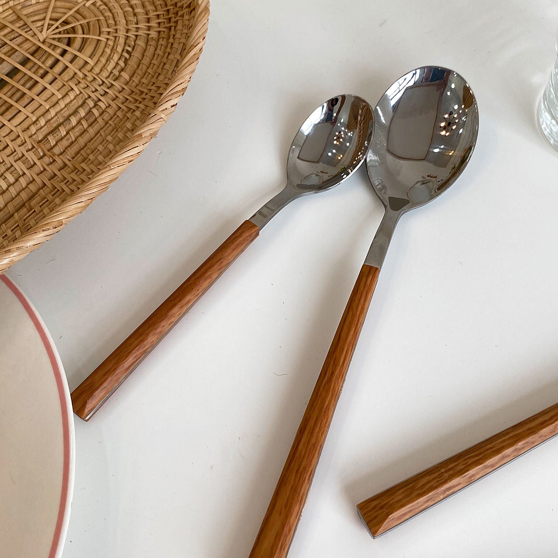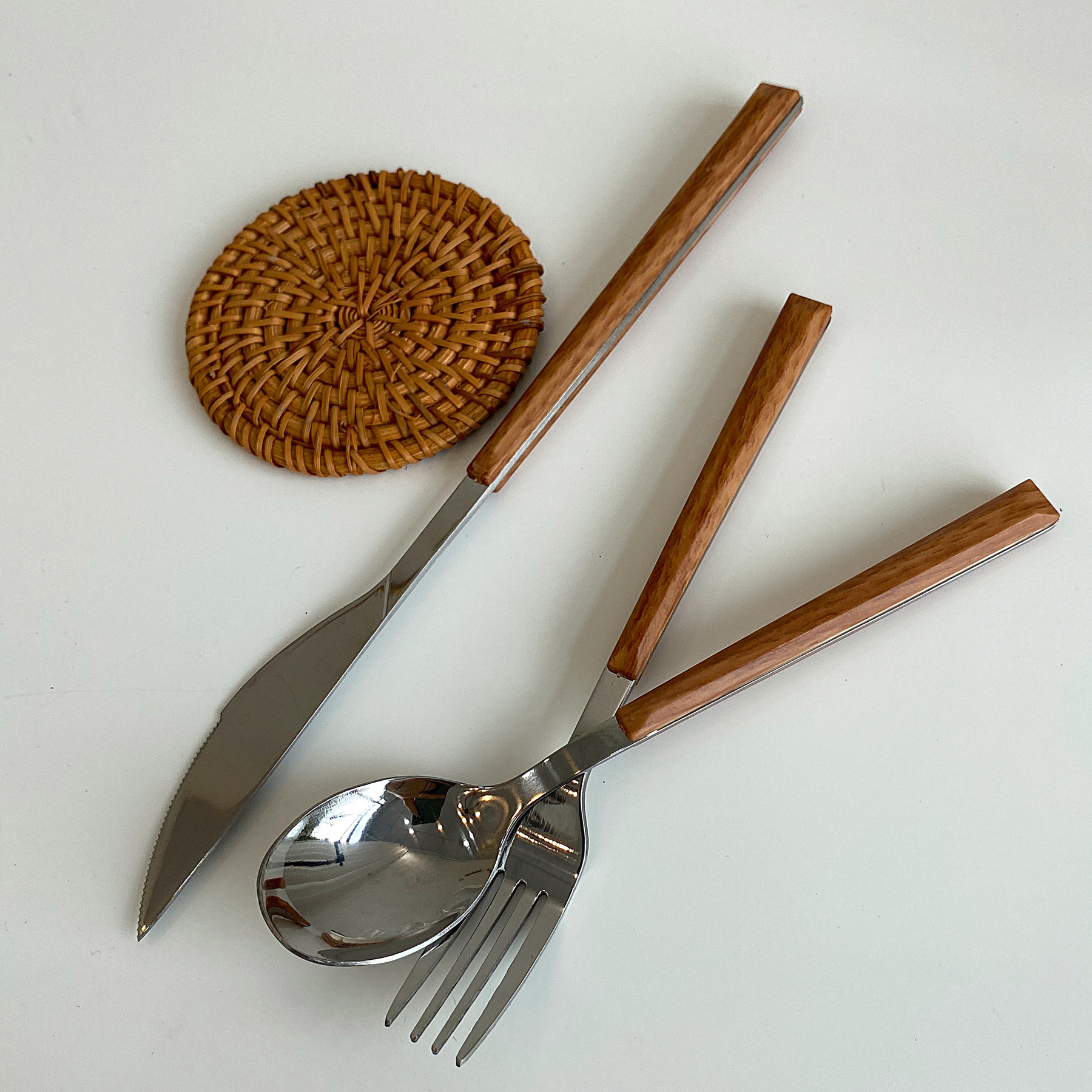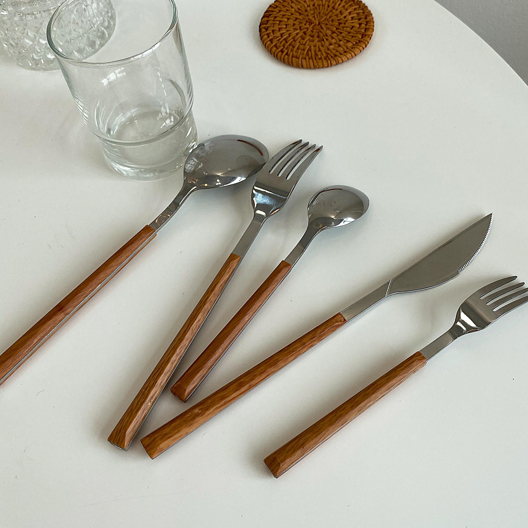 Imitation wood handle Small fork with imitation wood handle Small spoon with imitation wood handle Large spoon with imitation wood handle Large fork with imitation wood handle Large table knife