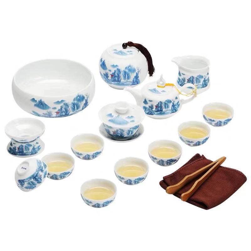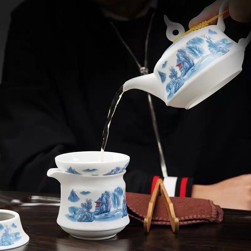 Jingdezhen ceramic tea set household frosted blue flower mountain kung fu tea cup pot high-end gift box