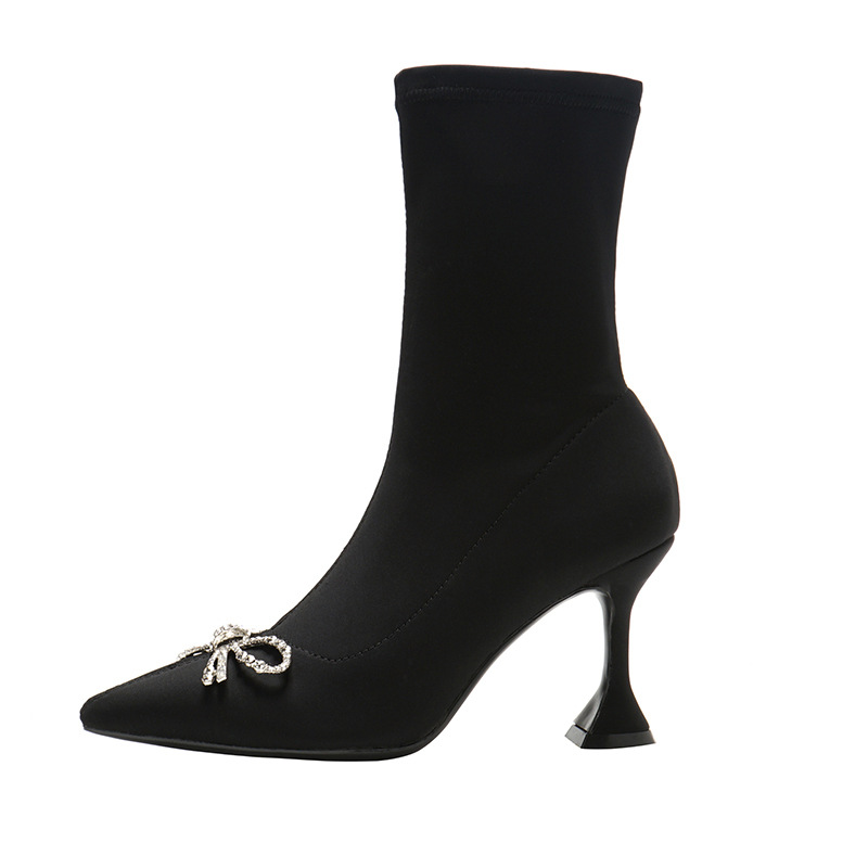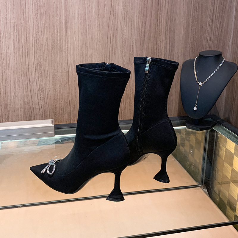 European and American wine glass heel zipper elastic women's boots thin boots bow buckle rhinestone ankle boots women's satin Martin boots high heels
