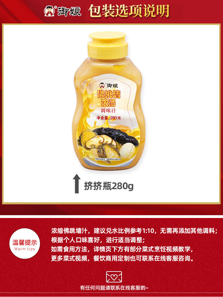 Squeeze a bottle of Buddha Jumping Over the Wall Thick Soup 280g, Hot and Sour Golden Soup Sauce 350g, Tom Yum Soup Sauce 300g Braised Sauce Sauce 310g Black Pepper Sauce 330g Sichuan Spicy Sauce