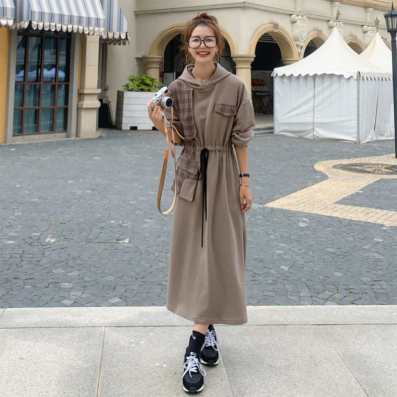 Plaid stitching dress women's 2022 spring and autumn new fashion temperament hooded sweatshirt long skirt waist slim skirt