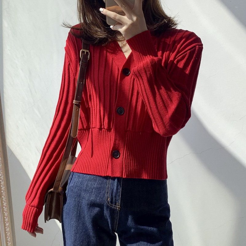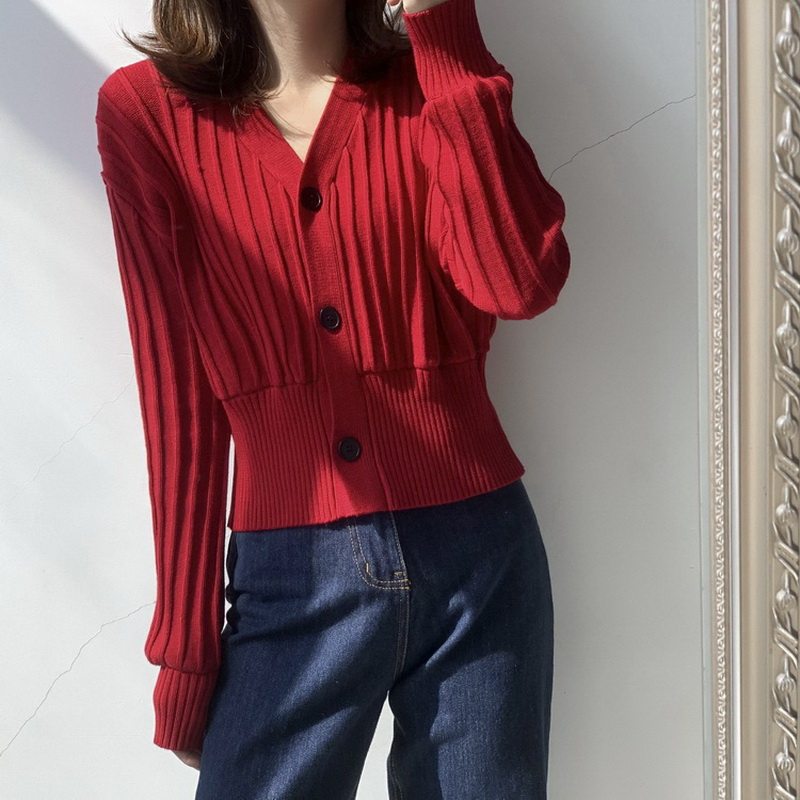 Red V-collar knitting sweater Spring and Autumn new Korean pie reduced age and short long-sleeved sweater