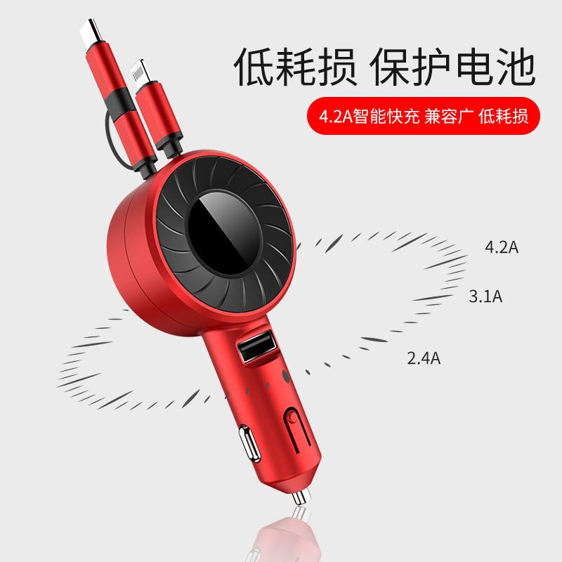 Three-in-one data line telescopic application Apple mobile phone on-board fast-charging one-drag triple charger Android multifunction flash-cigarette lighter converter Huawei Xiaomi Type-C connector charging line