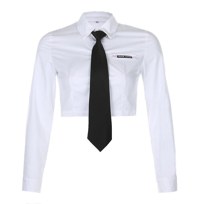 H Home Early autumn First Love Wind Academy Temperament Short White Shirt Female Personality Tie Letter Embroidered Blouse 100 lap