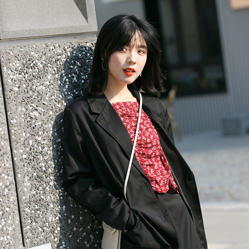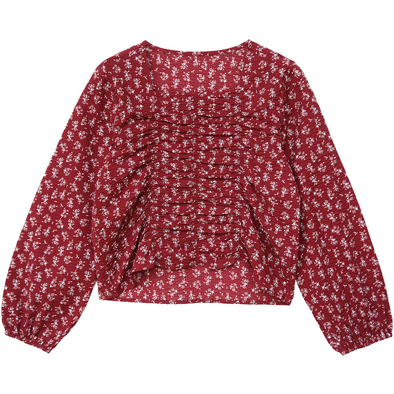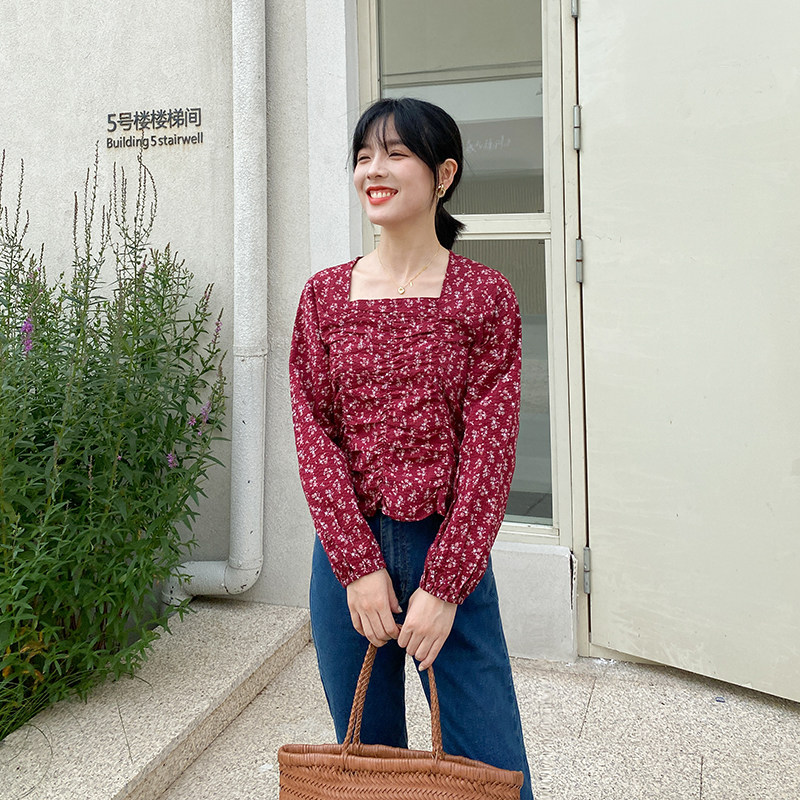 Huaji A591 red French retro lantern sleeve short square collar pleated floral shirt women's long-sleeved loose shirt