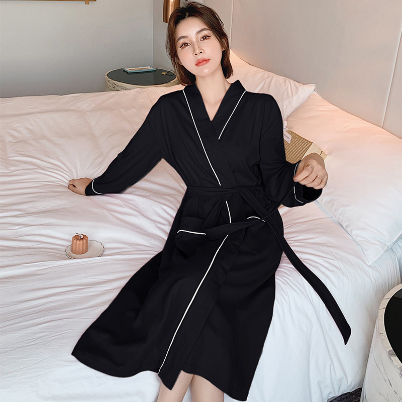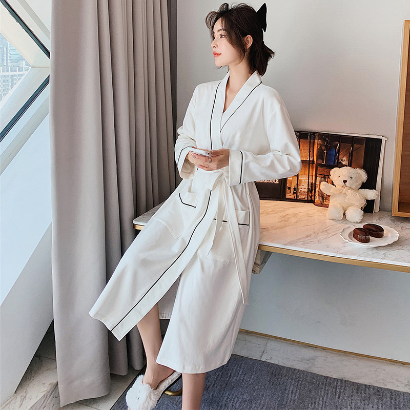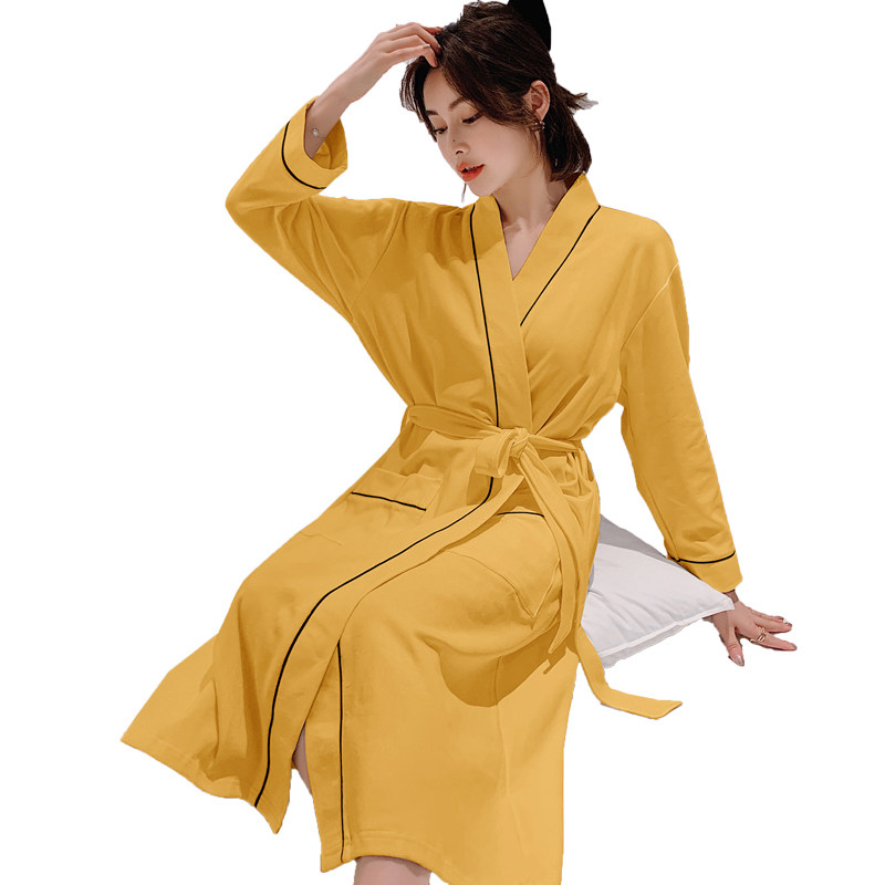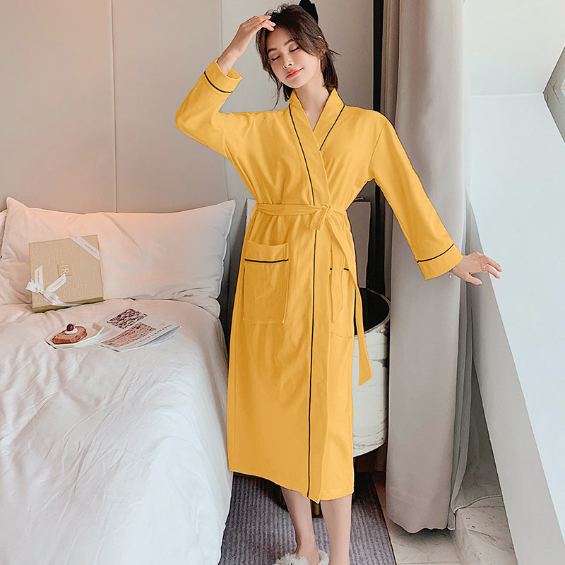 Long-sleeved cotton pajamas women's autumn kimono nightgown men's and women's solid color cotton long version large size bathrobe nightdress home service