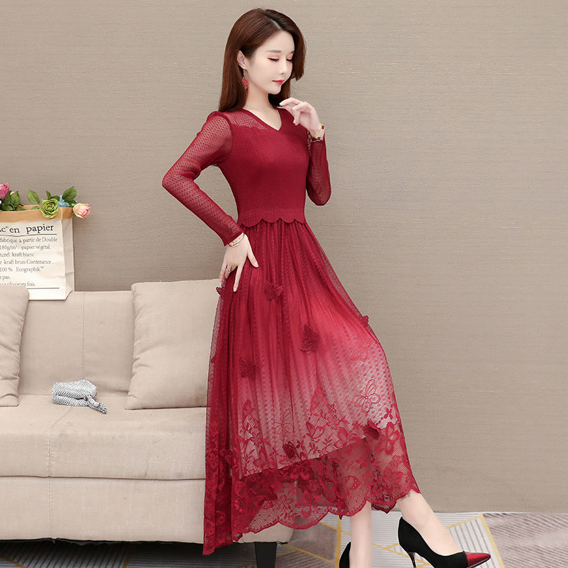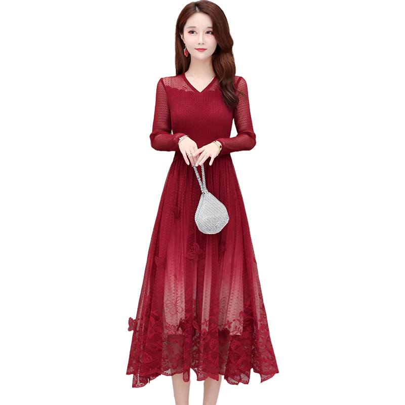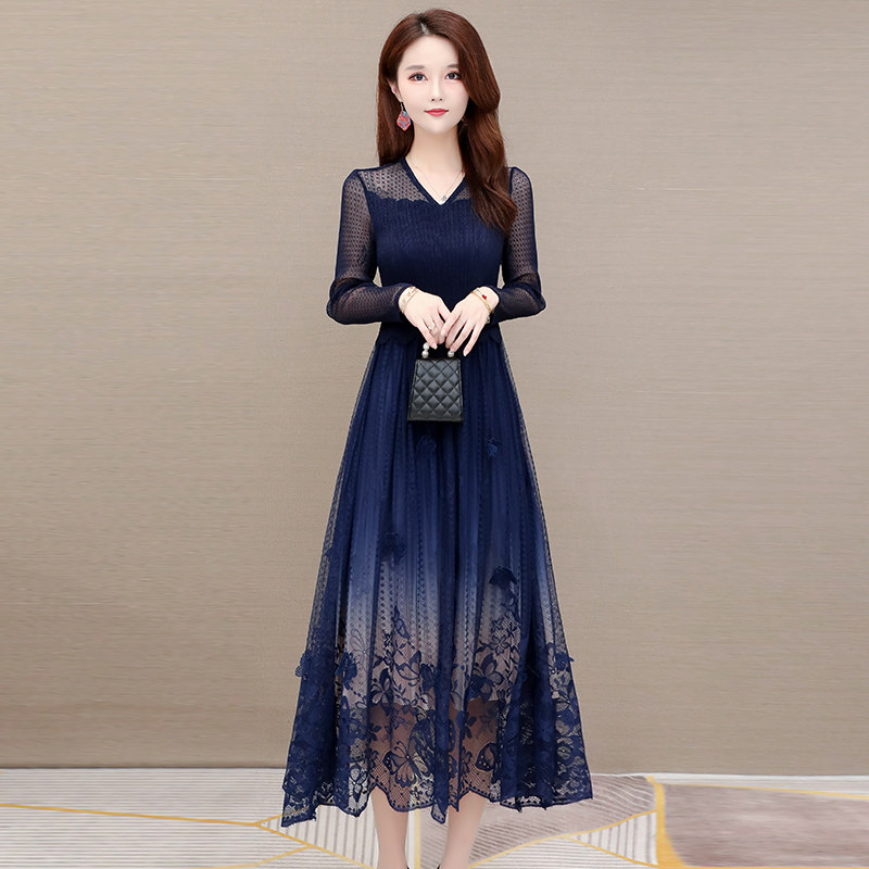 Temperament high-end socialite long dress 2020 autumn new design sense goddess fan lace mesh long dress