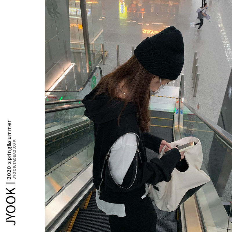 are U shop gray hooded sweatshirt women's loose Korean style spring and autumn thin section lazy jacket off-the-shoulder zipper top