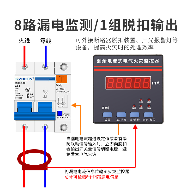 Panel-type residual current electrical fire monitoring detector module 8-way earth leakage monitoring fire linkage