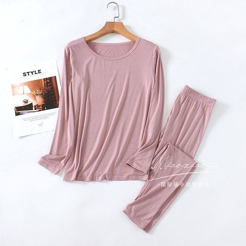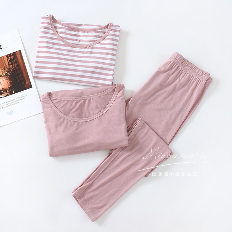 Fall Thin Modale Stripes Bottom close-fitting High Bomb Large Size Calorific Clothes Woman Autumn Clothes Sanitary Pants Suit Round Collar