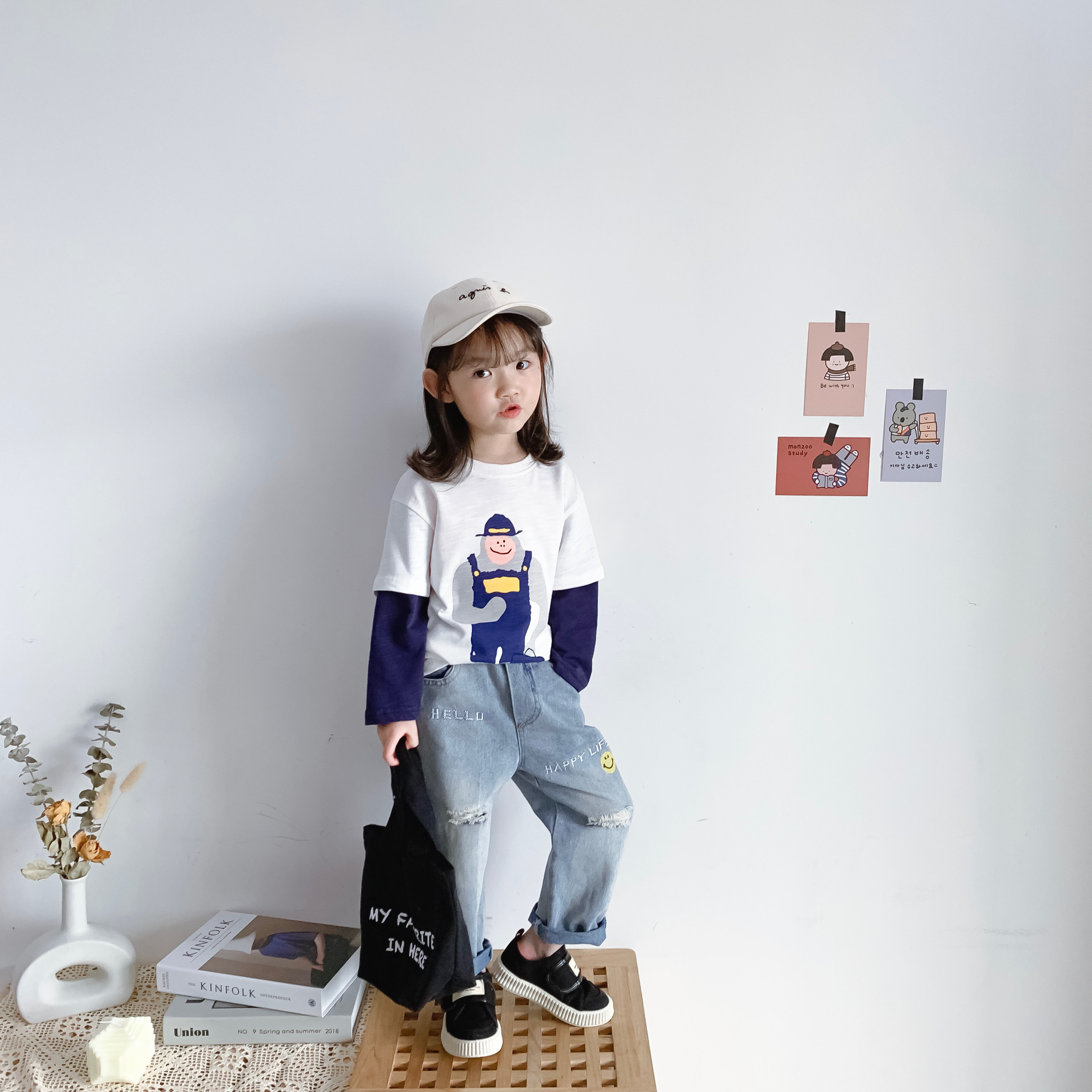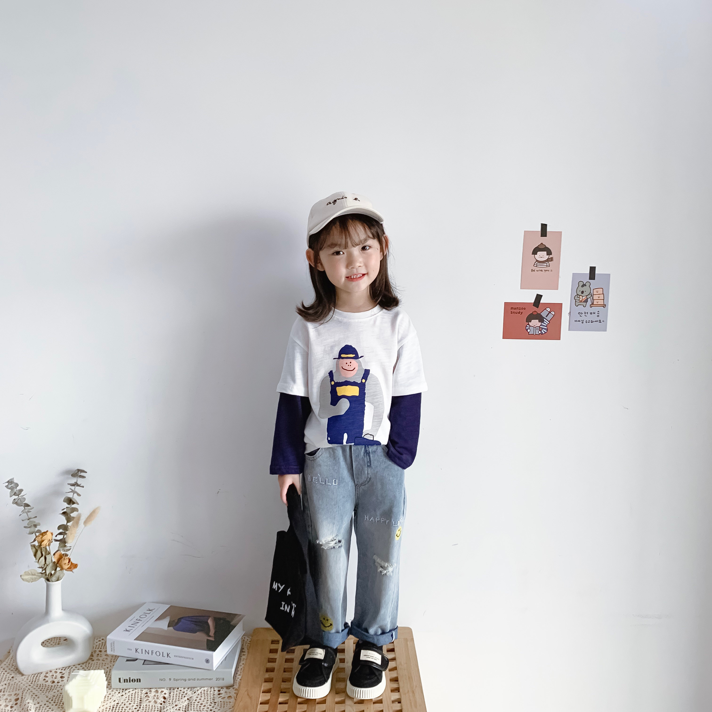 Bean Baujun 2020 Boy and Girls Baby Han Bamboo Festival Cotton Cartoon printing pattern fake two long sleeve T - shirt tide