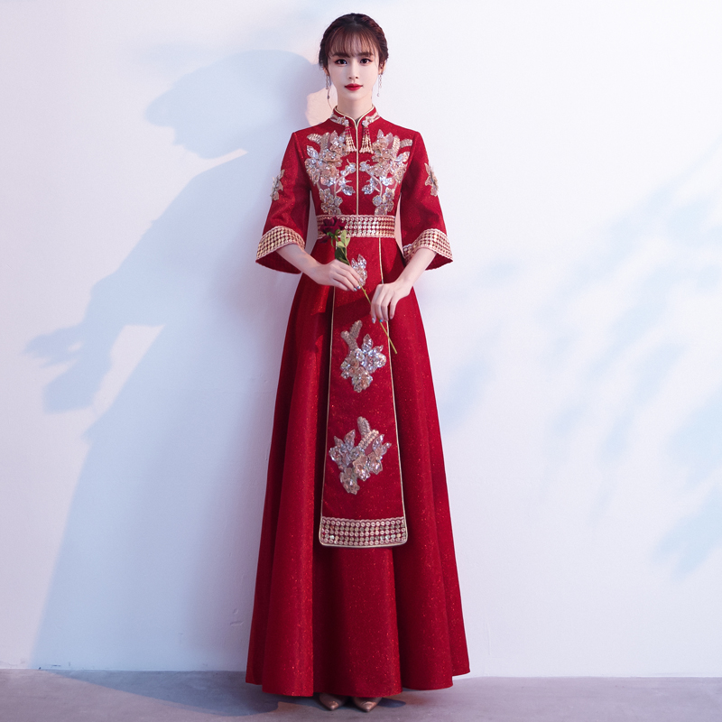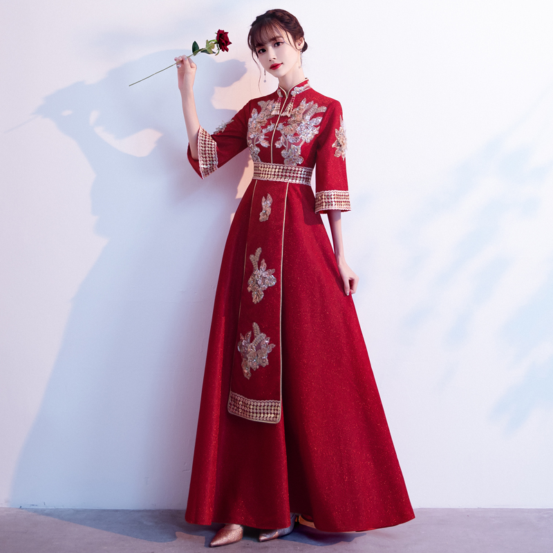 Toast with wine red color normally able to wear pregnant woman with high waist cover in Chinese style wedding gown woman bride back to door temperament