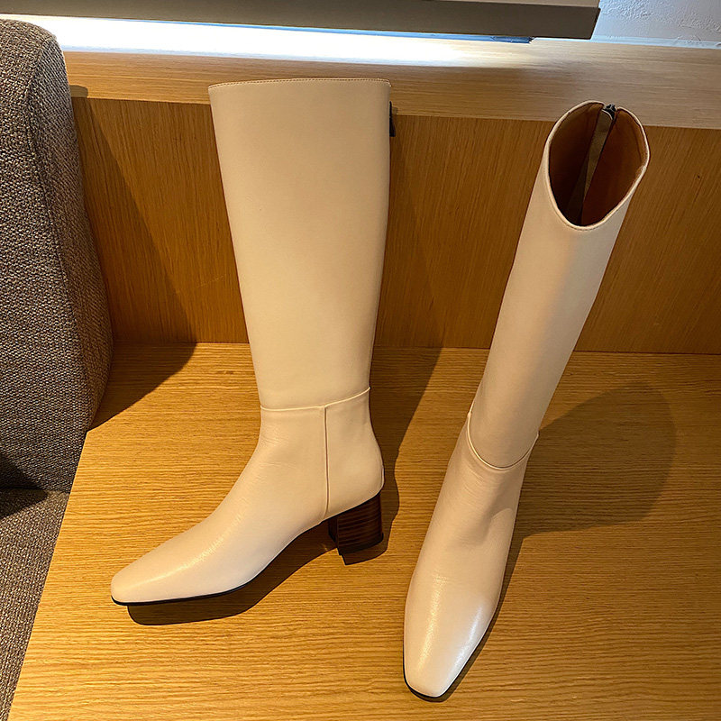 Yuan Circle South Korea High Cylinder Boots Woman however knee-length boots white coarse heel riding boots Genuine Leather Square Heel heel boot