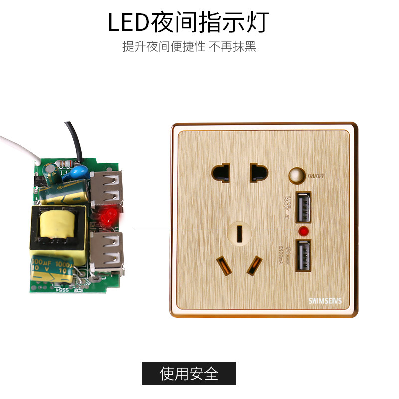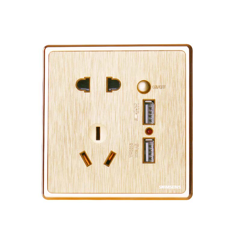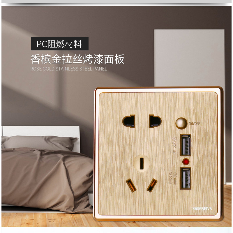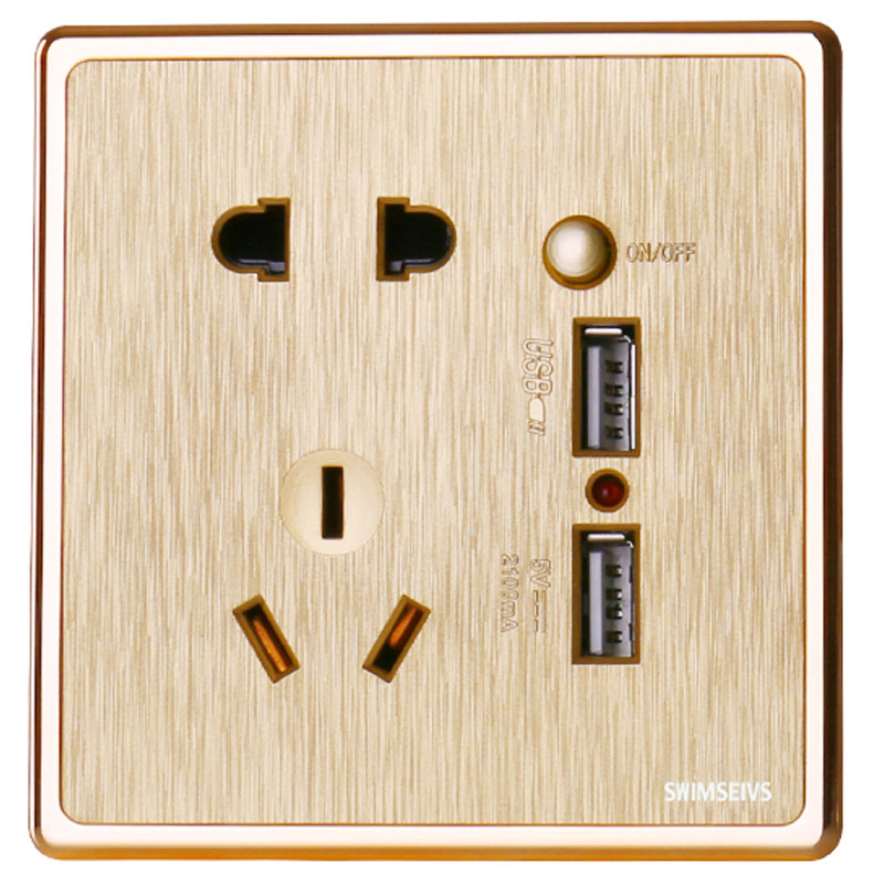 USB with five-hole switch socket Household dual-port USB champagne gold 2 1A5V mobile phone charger USB