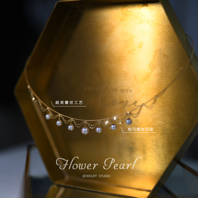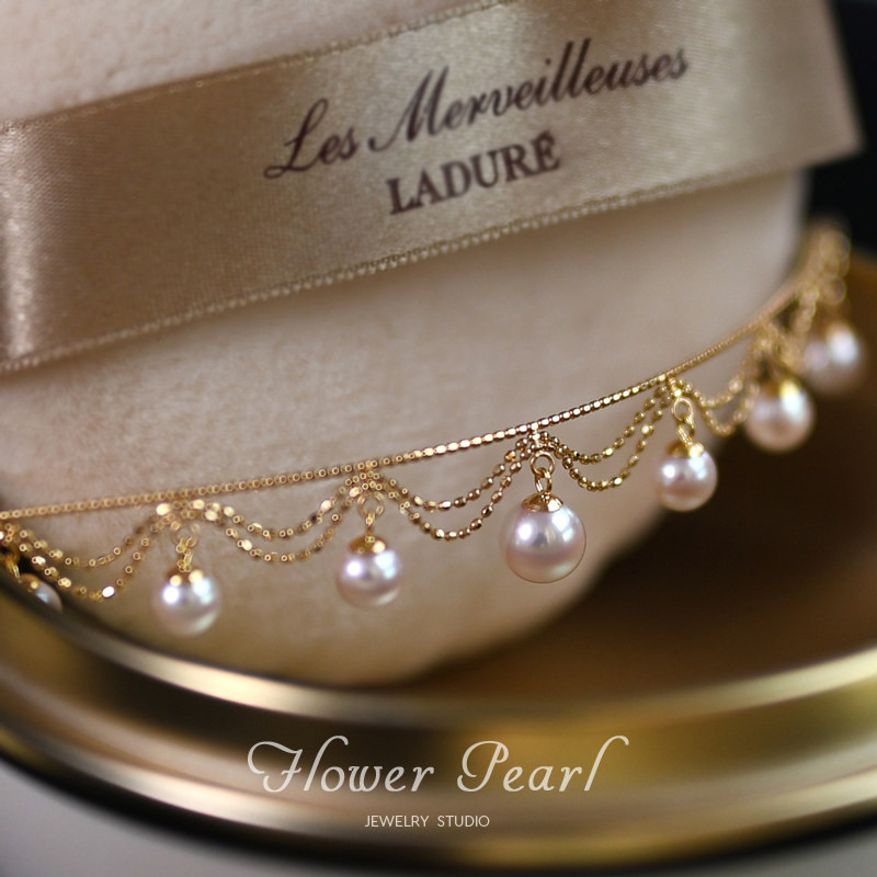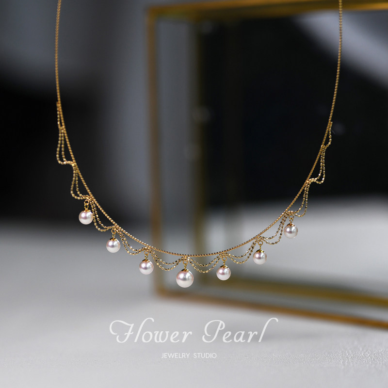 Seven Princesses Japan Aurora Akoya Sea pearl 18K gold laser dazzling flash beads Bead chain Lace Collar Necklace