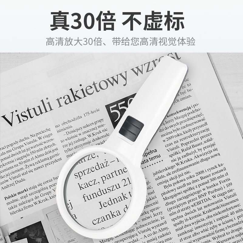 High power HD handheld optical magnifier 30 times children student magnifying glass LED light HD senior 10 times