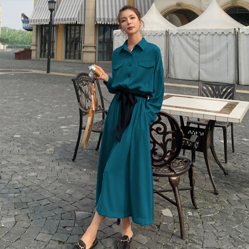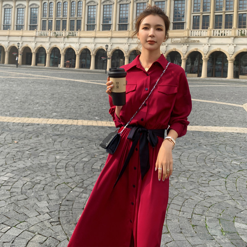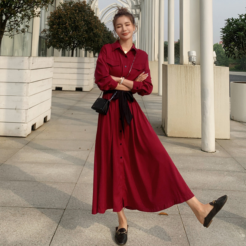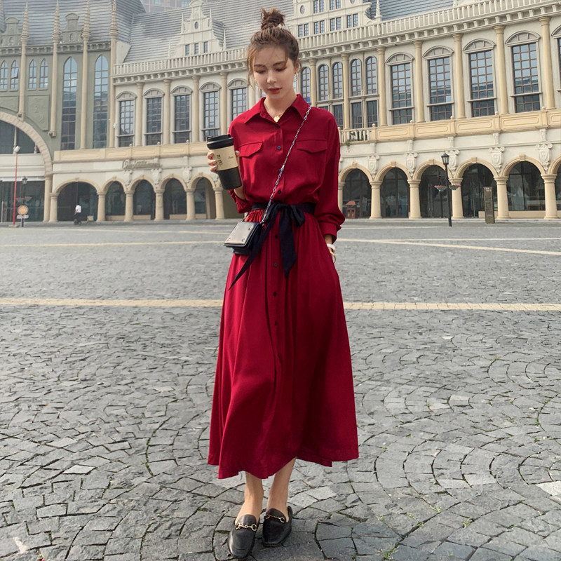Red French thin long-sleeved shirt dress women's spring and autumn 2022 new age reduction super fairy temperament waist long skirt