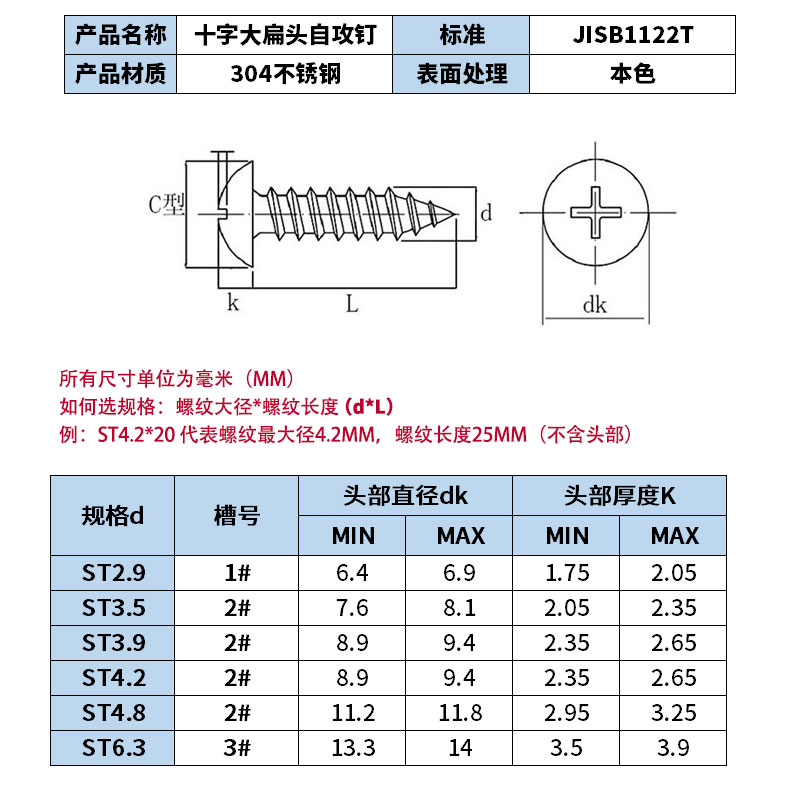 ST4 8 ST6 3 Dongming 304 stainless steel cross flat self-tapping nail JISB1122T cross large round head