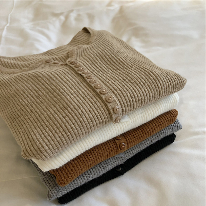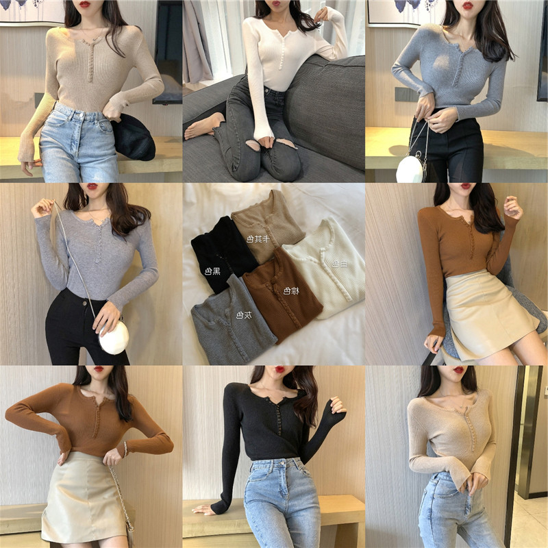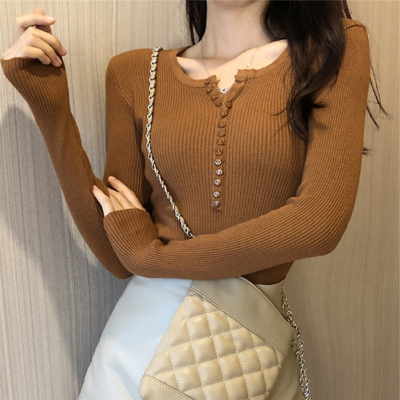 Autumn new Han edition chic button knitton pure long sleeve sleeve sleeve and thin shirt