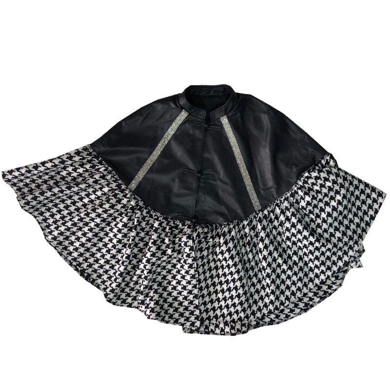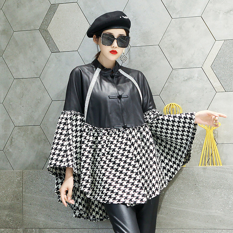Leather plate button patchwork leather coat female sheep leather stitching heavy industry inlaid diamond cape new loose large size jacket