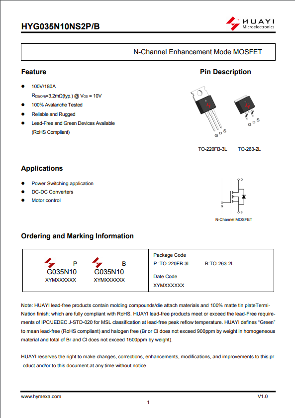 HYG035N10NS2P HYG035N10NS2P 100V180A 3 2 m Ω Fast opening MOS tube stable durable original plant agent