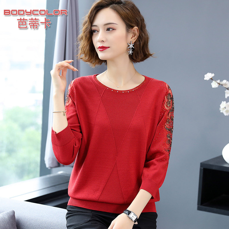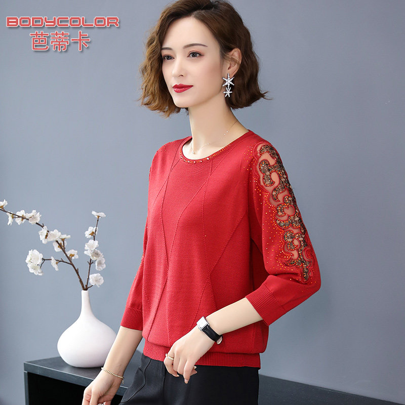 2021 new item middle-aged woman spring and autumn T-shirt foreign school blouse elderly mother thin item long-sleeved bottom shirt