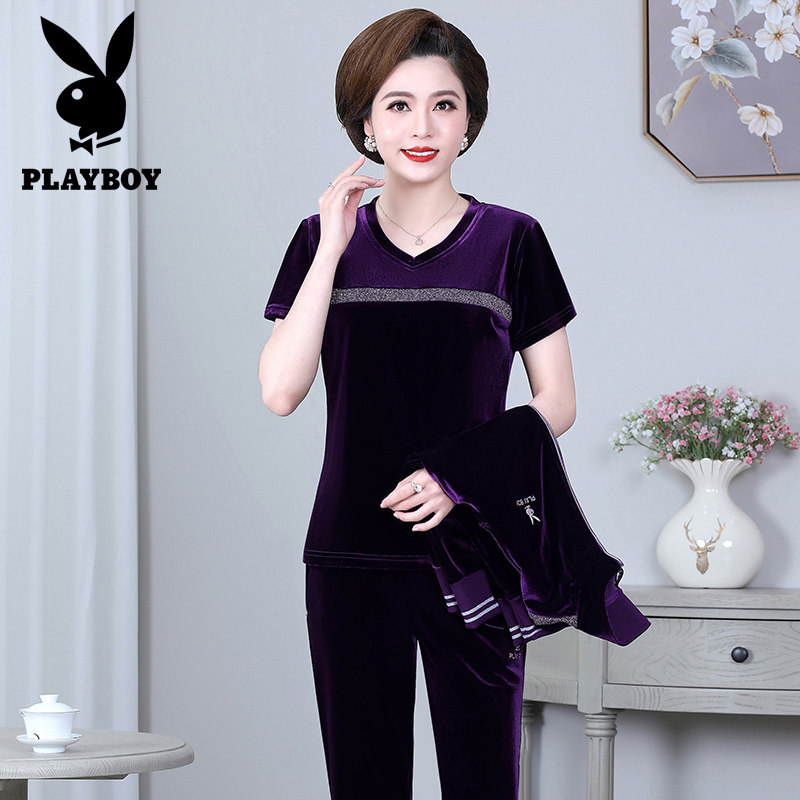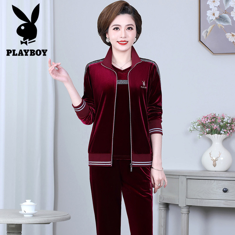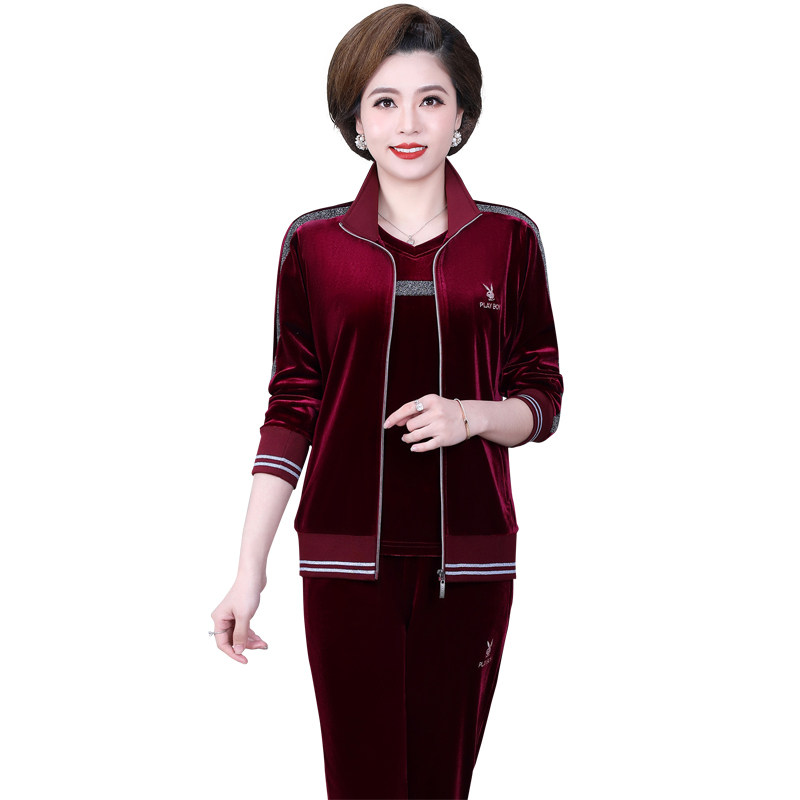 Flowers Playboy Sports Suit Women Casual Two-style Middle Aged Mother Dress Spring Autumn Gold Silk Suede Cardiff Cardiff