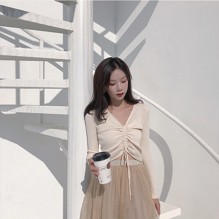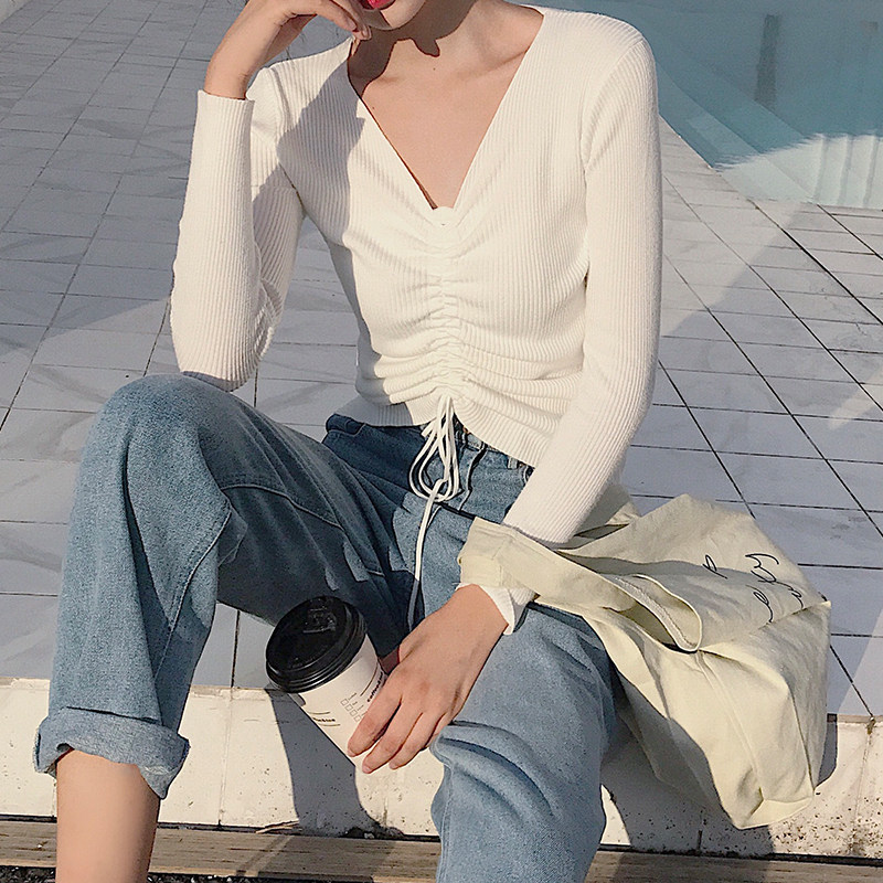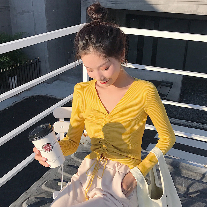 Fall V collar Long sleeves Knitted Sweatshirt Woman Sleeve Head Dressing short draw Rope Tight blouses 100 hitch a bottom fur coat