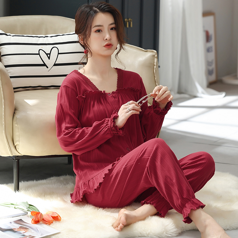 Red Pyjamas Woman Spring Autumn Pure Cotton Long Sleeve Korean Version Lady Princess Wind Bunches Foot with a large size of 200 kilos