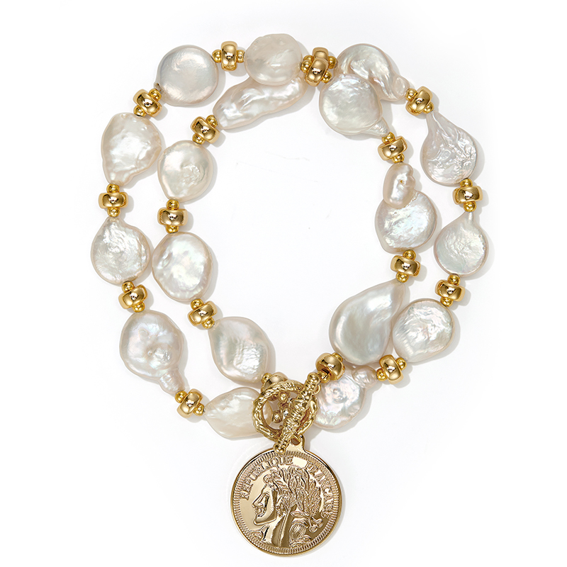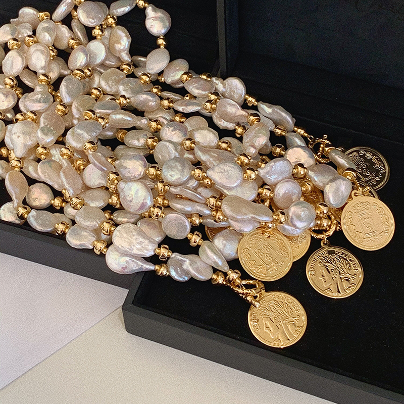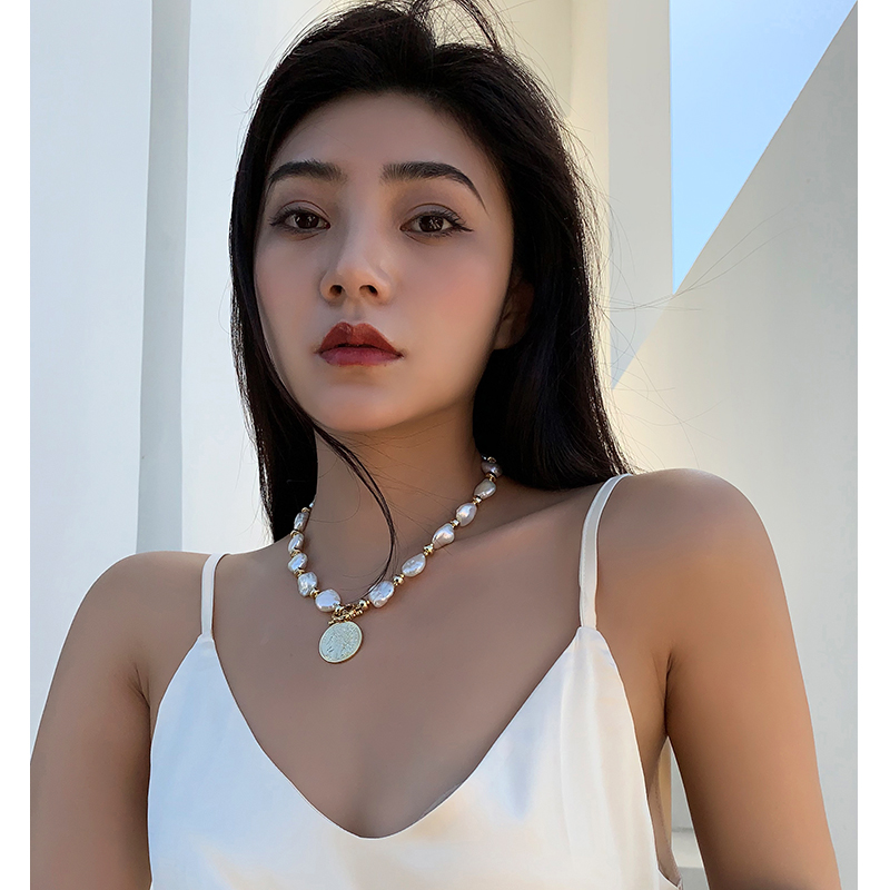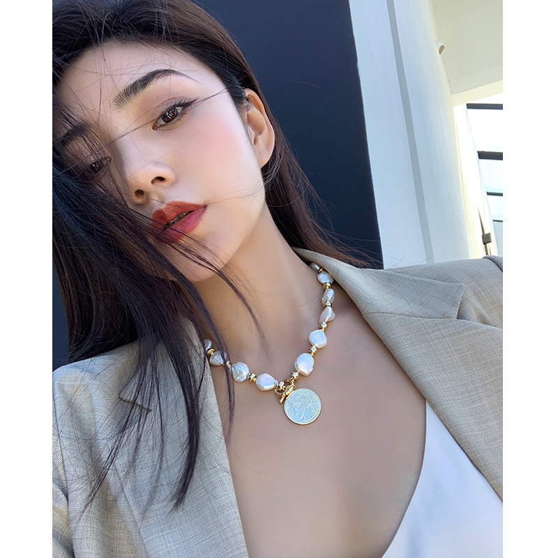BO N E E BAROQUE PEARL NECKLACE GOLD COIN PENDANT LOCK BONE CHAIN ADVANCED SENSATION SMALL AND LUXURIOUS NECKLACE GIFT WOMAN