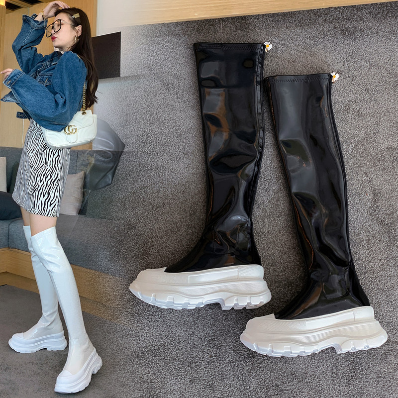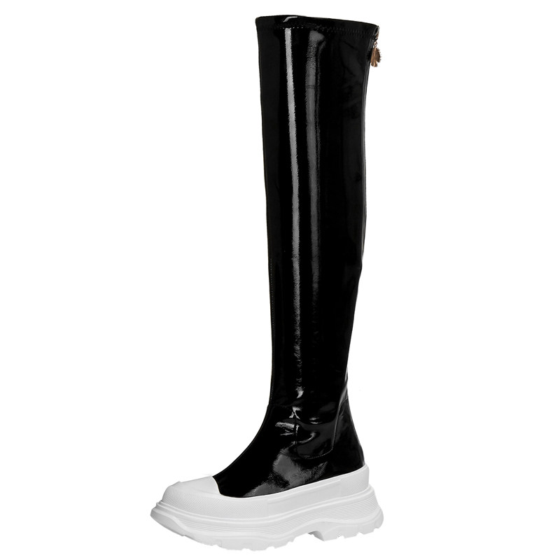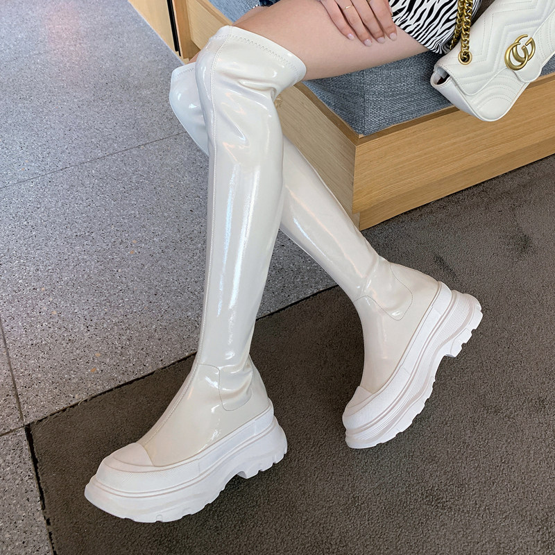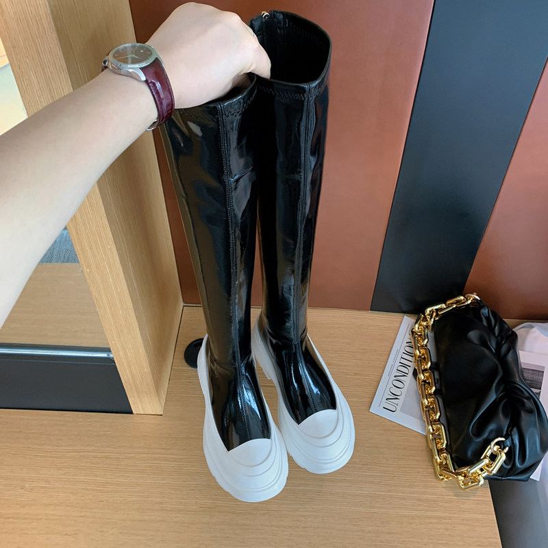 2022 Autumn Winter New Thick Bottom Over Knee Long Boots Virgin Lacquer Leather Pine Pastry High Cylinder Boots Long Barrel Slim Leg Rider Elastic Boots