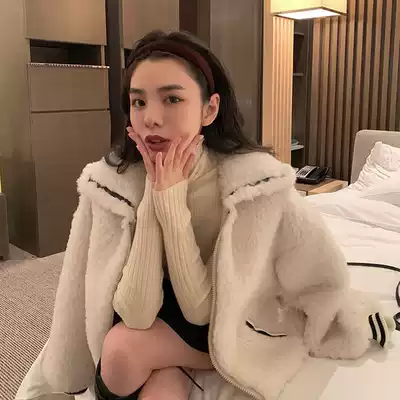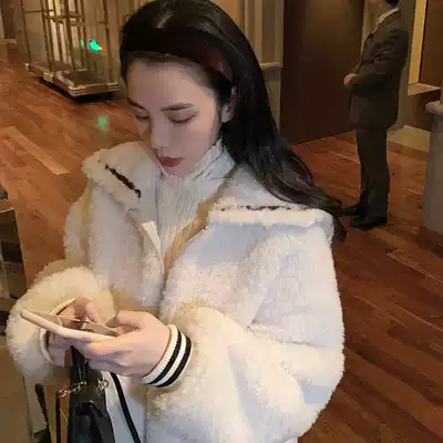 Lamb coat women's long version stitching thickened wool coat 2021 Winter New ins Navy wind students