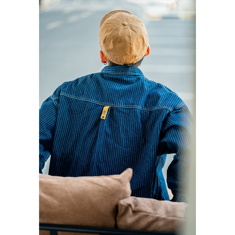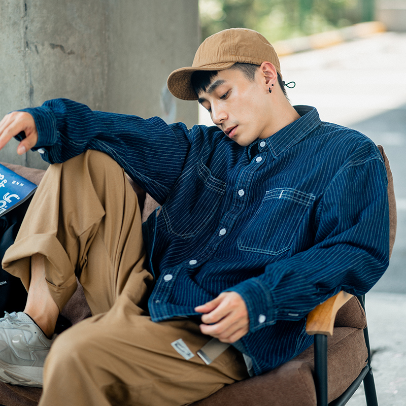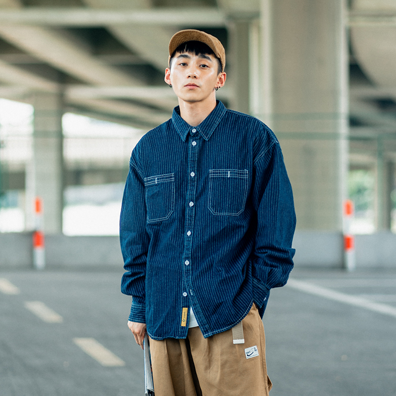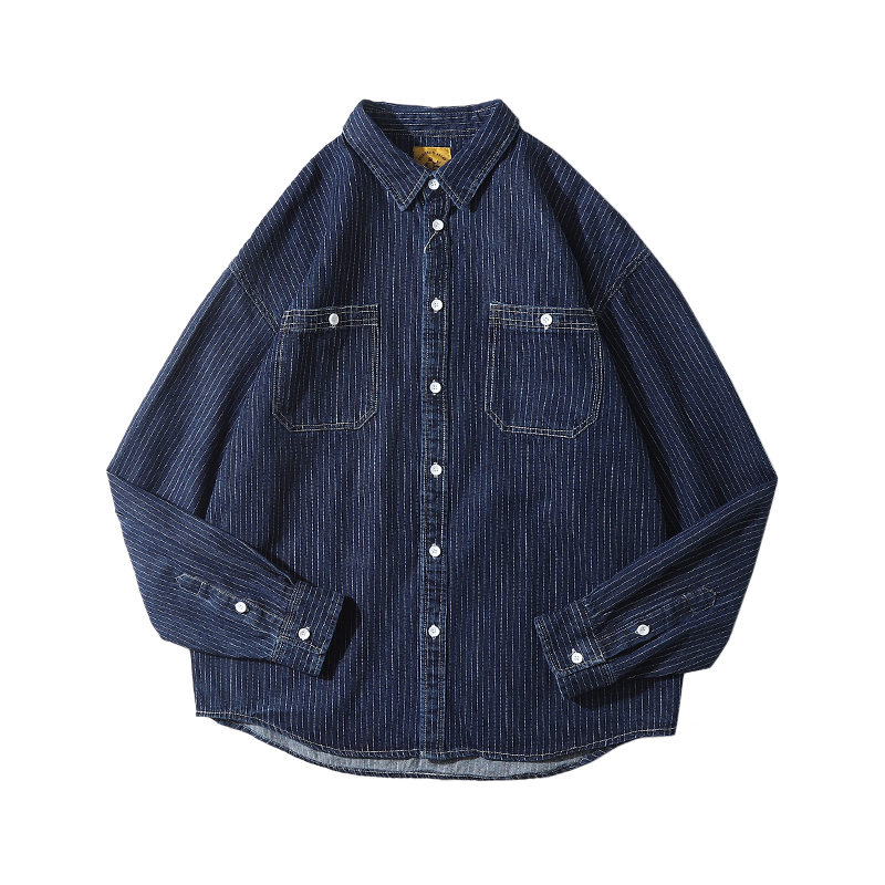 BDCT Vertical Stripe Lapel Denim Shirt Men Autumn Loose Pocket Tooling Long Sleeve Trendy Brand Shirt