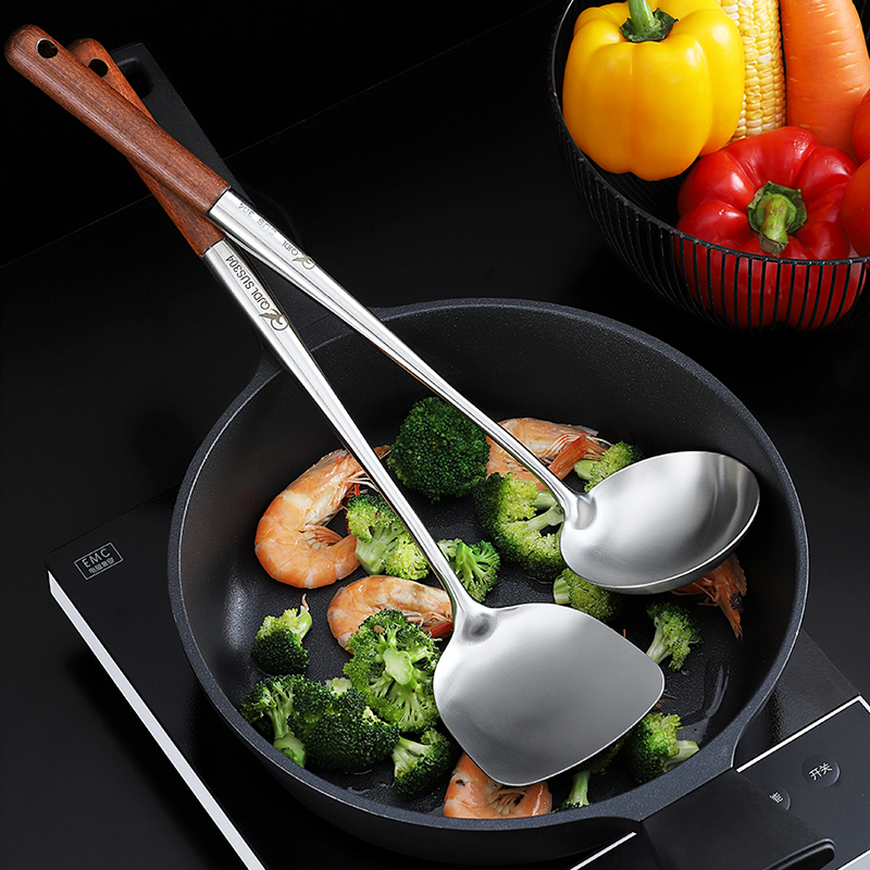 Pear Blossom Wood 304 Stainless Steel Pan Shovel Kitchenware Cover Set Soup Spoon Saute Scoop kitchen Home Fried Spoon Leak Spoon New