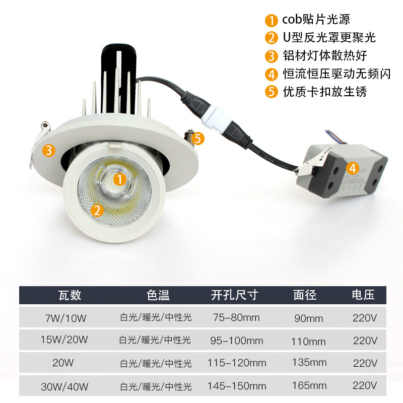 7 watt white light drilling 75-80mm elephant trunk light 7 watt warm light drilling 75-80mm elephant trunk light 7 watt neutral light drilling 75-80mm elephant trunk light 10 watt white light drilling 75-8