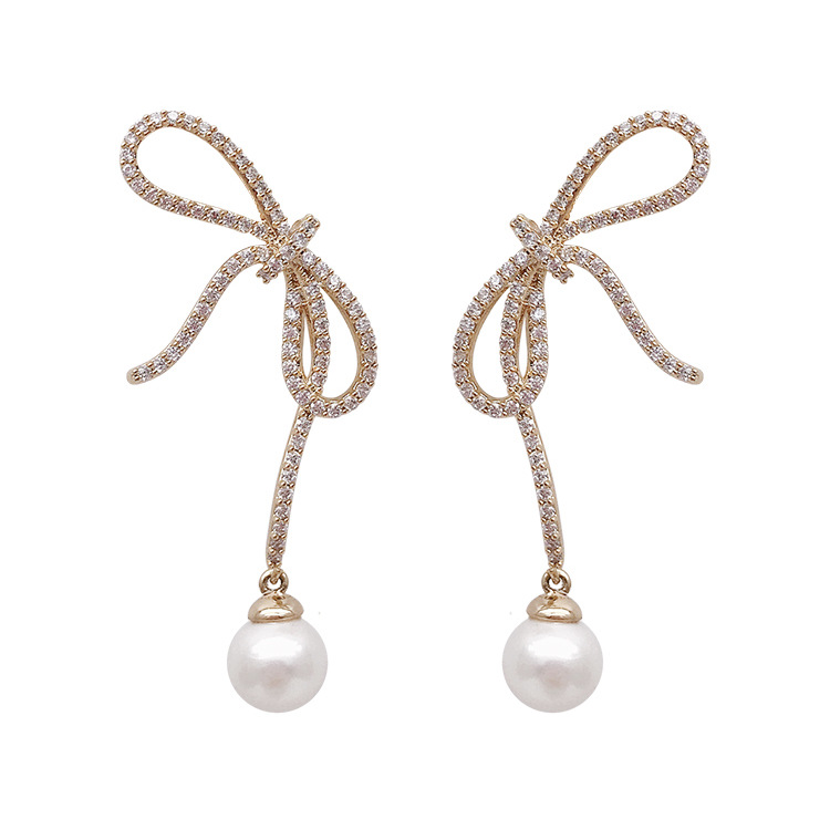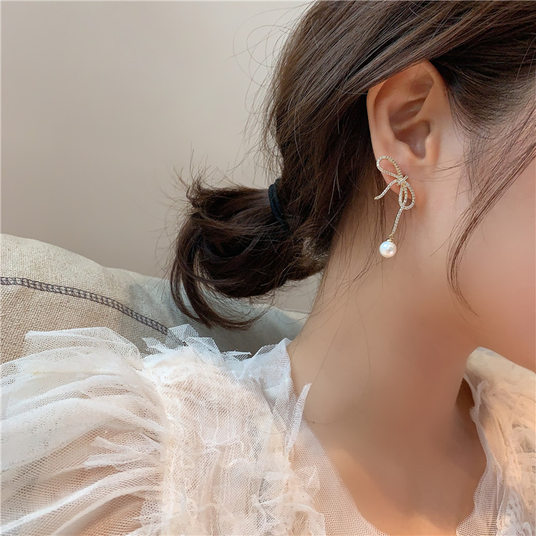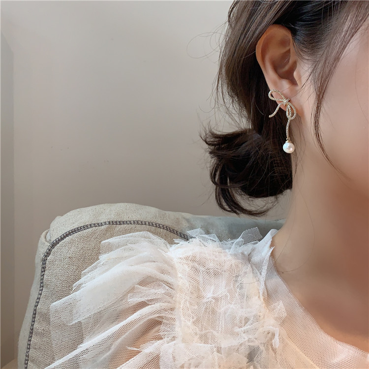 Bow knot diamond pearl long version super fairy earrings female South Korea Dongdaemun high-end ear needle net red temperament earrings