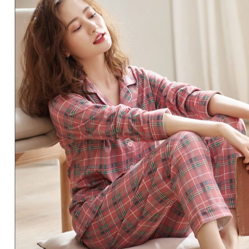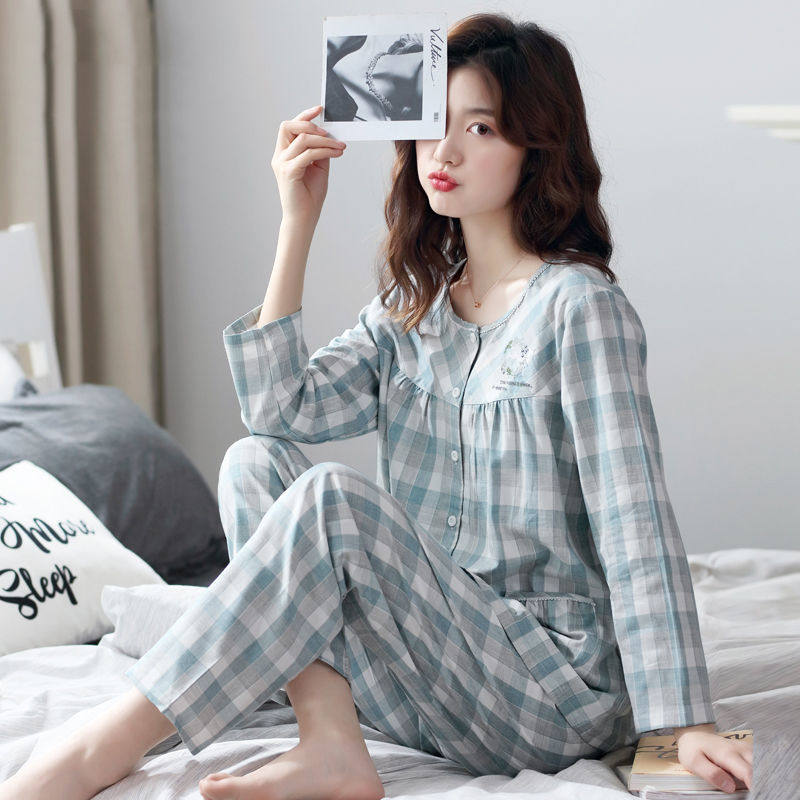 Cotton Sleeping Dress Lady Spring Autumn Season Long Sleeve Cardiovert large size Korean version Leisure student Home Suits Suit Moon summer
