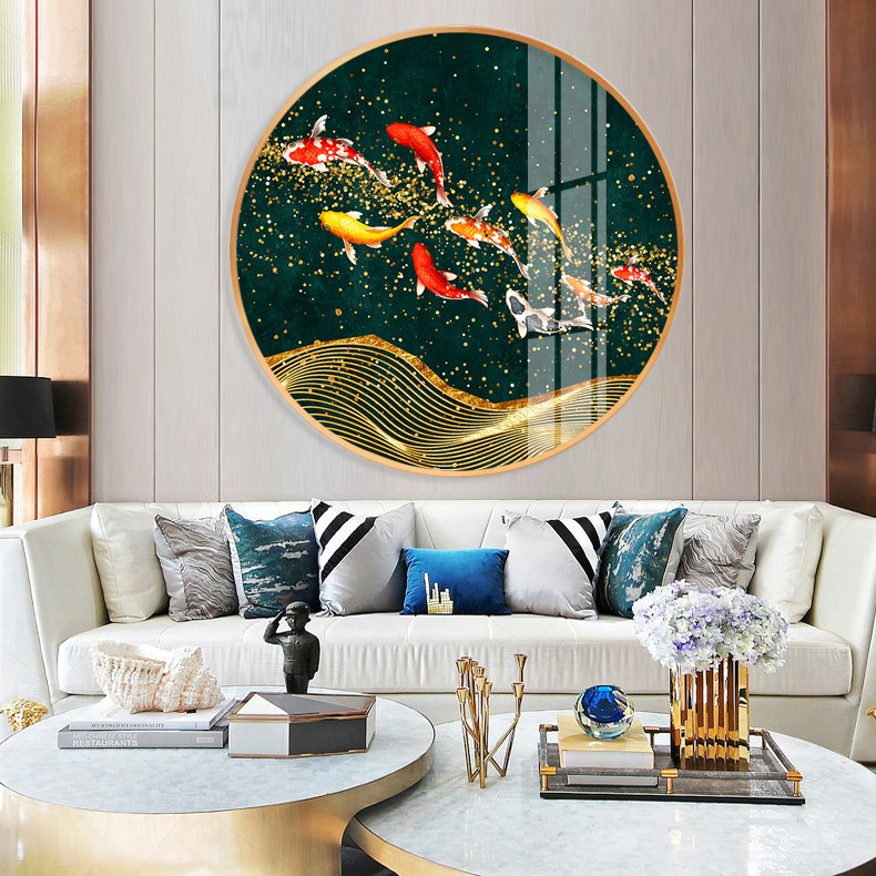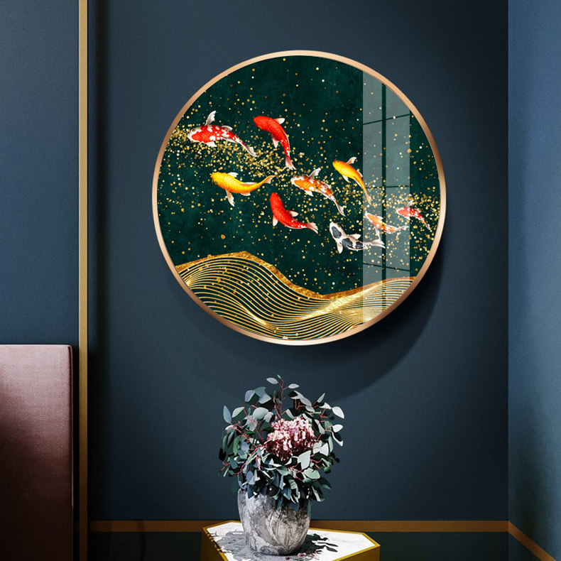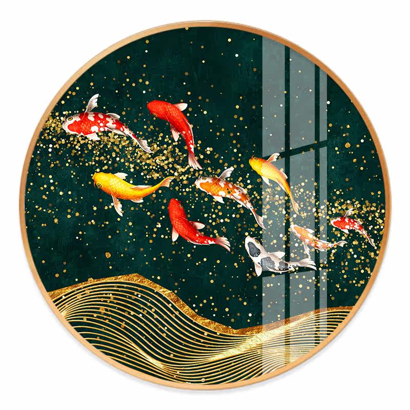 Nine fish picture green background New Chinese style round decoration painting living room hanging painting crystal porcelain painting carp Xuan guan mural dining hall